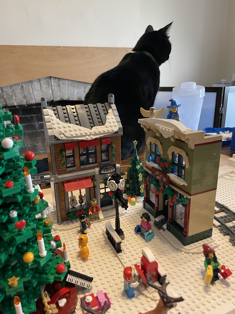 To get a feel for how it might look and its size, I set everything up on my dining table. I took a while moving the sets around, trying to find a cohesive story with what I had. Raven, one of my cats, was on hand to be a brick relocation associate if needed.