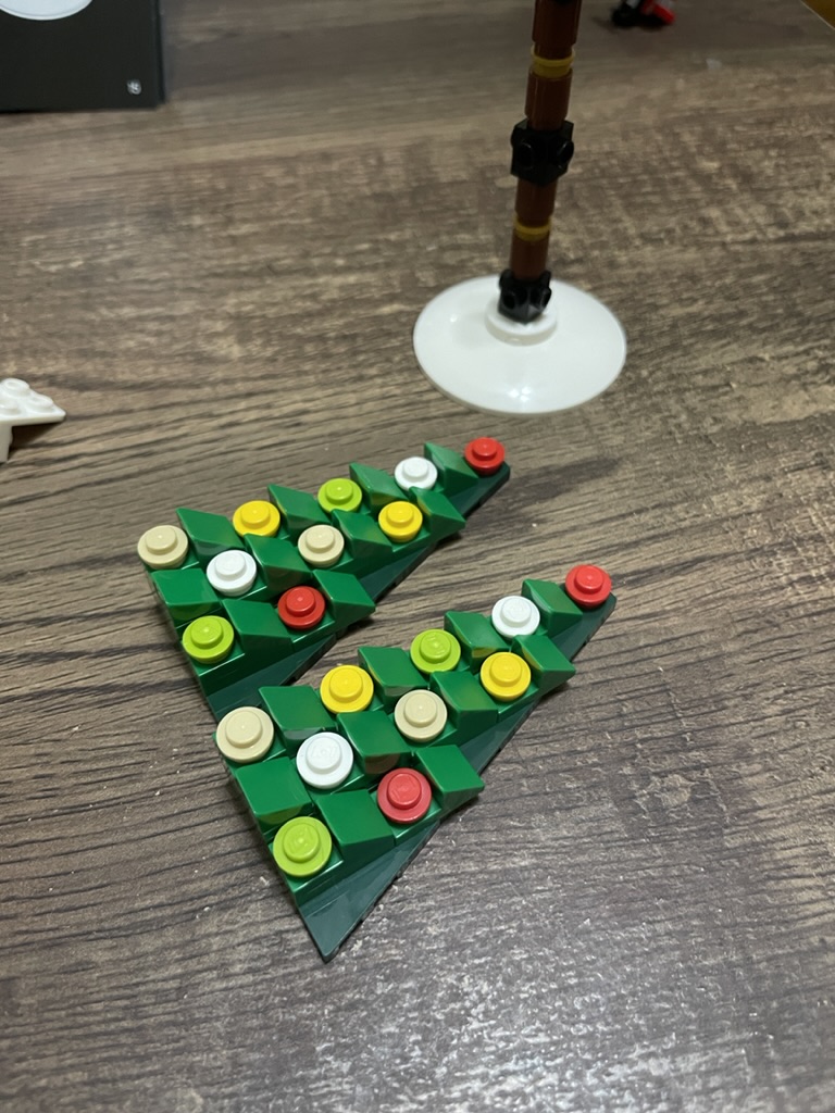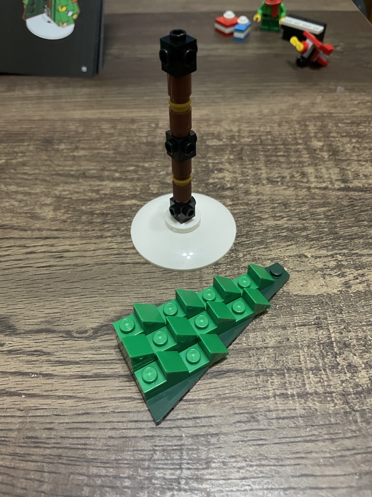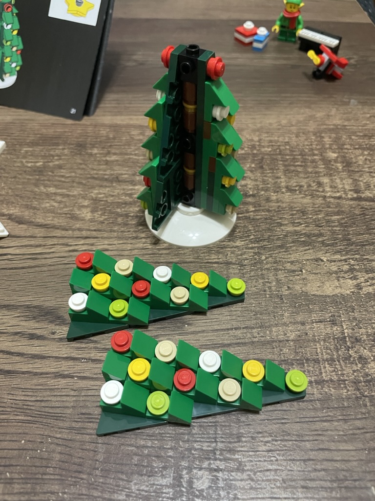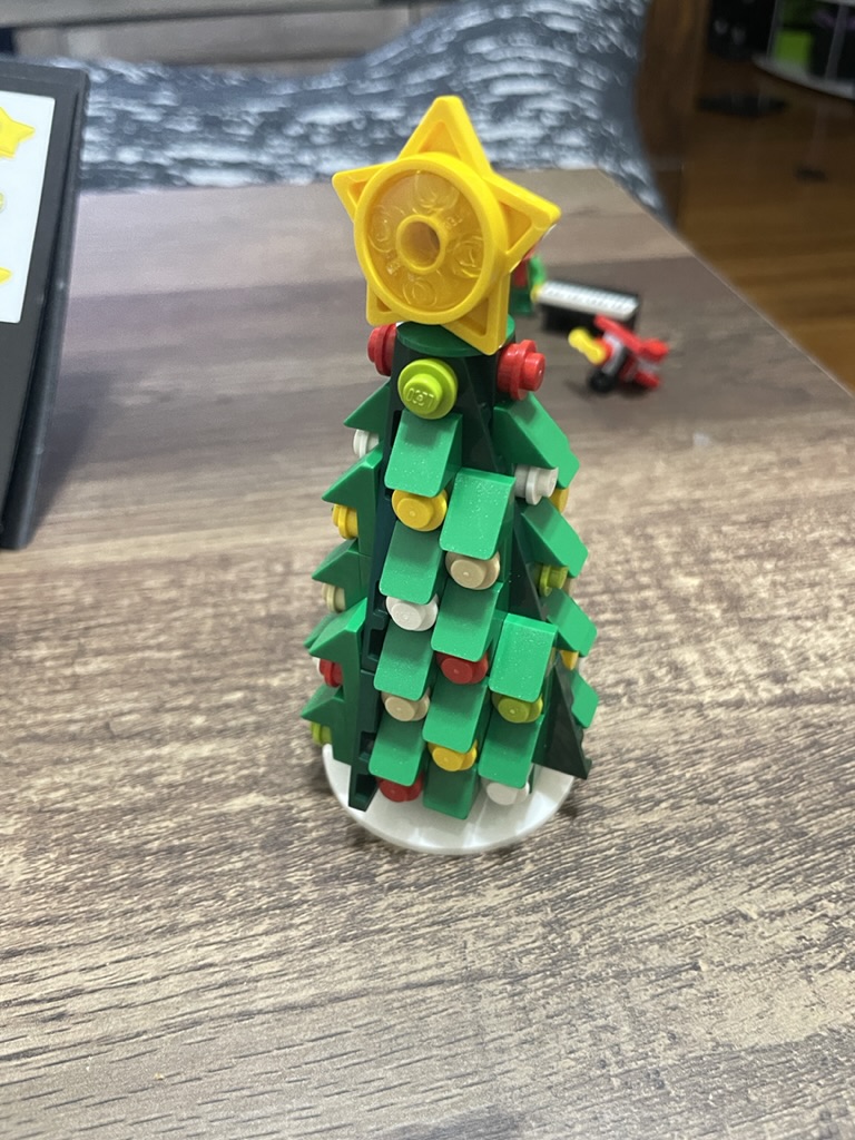 Each Christmas LEGO set has a tree element; this tree is better than most. There is a lot of detail using green cheese wedges and studs to generate a realistic, decorated, and textured tree. At the top, you build an impressive star.