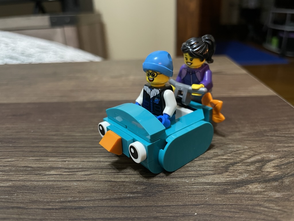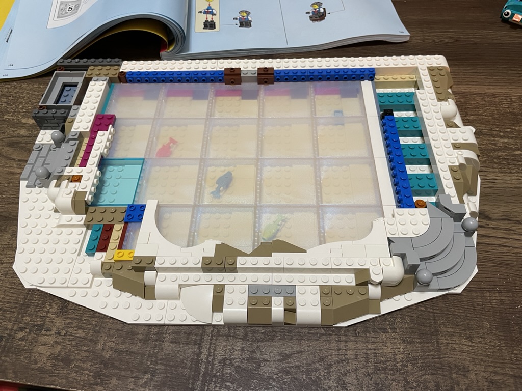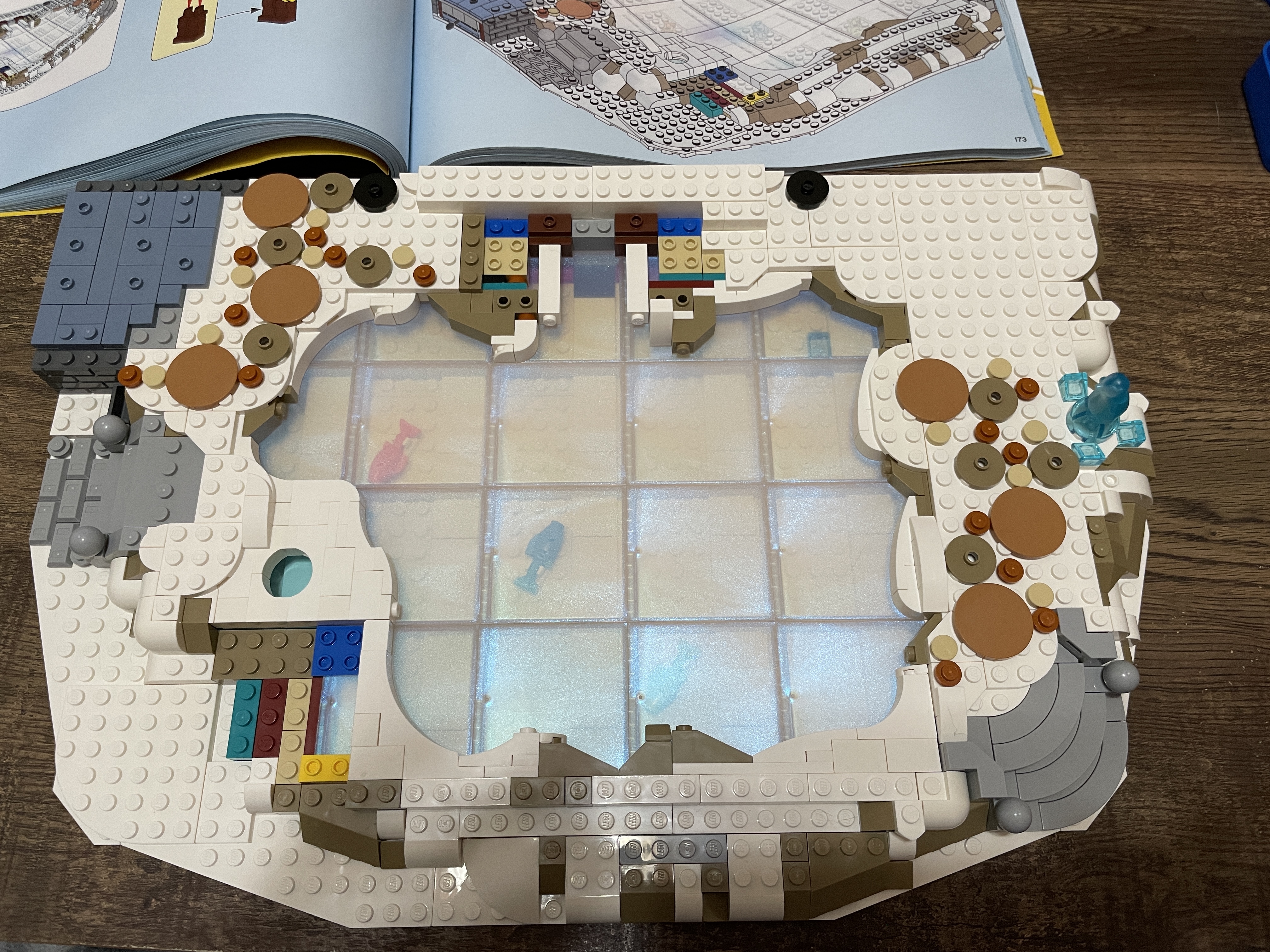 I adore the ice hockey minifigure that came next. His face is angry, and the accessories are practical and brilliant. As for the rink, fish are trapped below the panels, which is a great detail. Later, there will be an ice fishing hole, so I am not traumatized – the fish are alive and well below the ice! When I saw the sparkly panels to be used as the ice sheet, I was skeptical that they would look good. For a couple of days, I wasn’t convinced that they did. However, it grew on me, and I now accept that it was excellent part usage to create a vast rink with minimal pieces. Does it beat translucent blue tiles? No, it does not, but you would lose the fish below. It’s a tradeoff, and I understand LEGO’s choice to go for the panels.