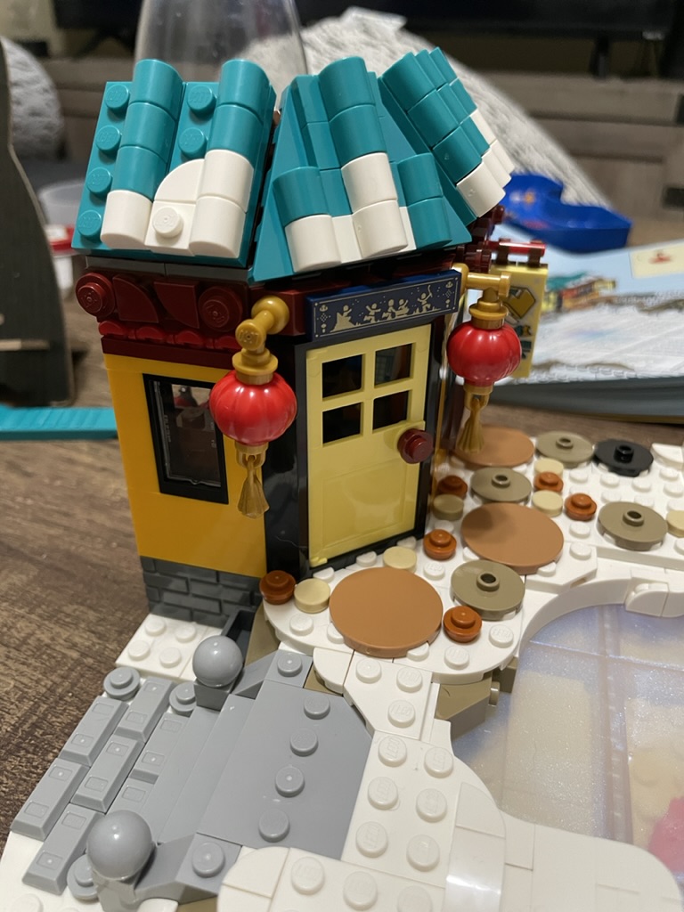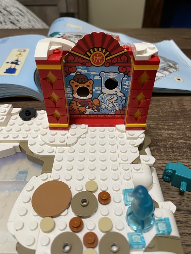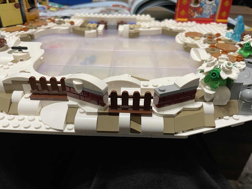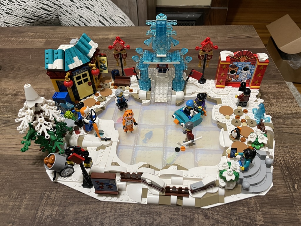 Overall, I am impressed with this set; it looks better in person than the box images or even the ones I have captured here. There are some design aspects that I am not a fan of, however. The tan doesn’t look great against the white to create the exterior of the rink. Similarly, I’m not convinced by the choice of tan and brown for the stepping stones. Likely, blending this color scheme with the translucent blue ice sculpture and red of the Chinese tradition just doesn’t work. It’s too busy and comes across as a messy design. Luckily, I can change all these things by swapping or removing parts.