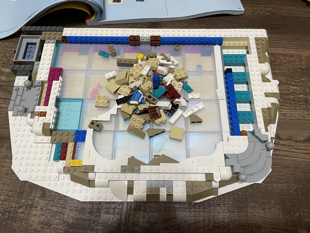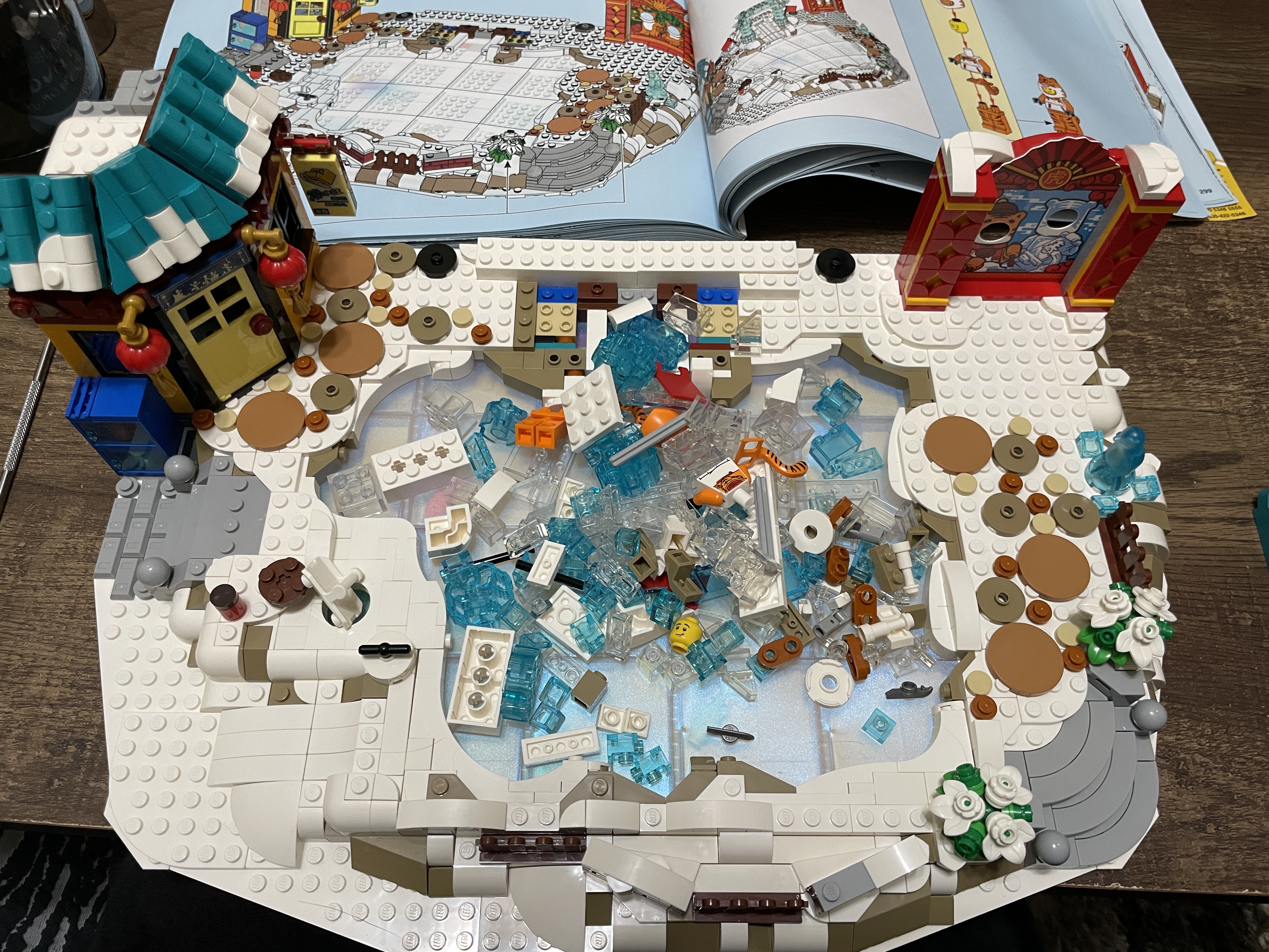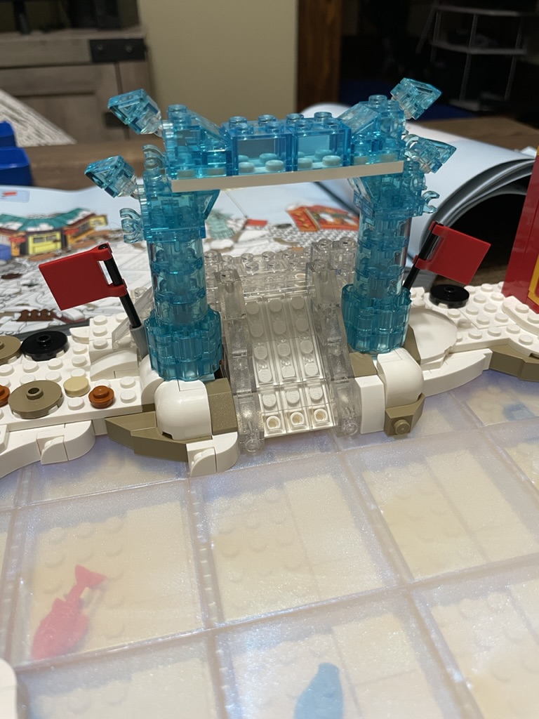 The ice sculpture is arguably the centerpiece of this build, though I wasn’t convinced it looked good on the box. The design is a bit elaborate for my taste, and I proffer that the translucent blue made me feel something was “off” about it. However, I must say, in real life, it looks better, and it was illuminating how the LEGO pieces came together to make a magnificent ice sculpture. I like the ice slide underneath it, and I have pushed a few minifigures down it this week!