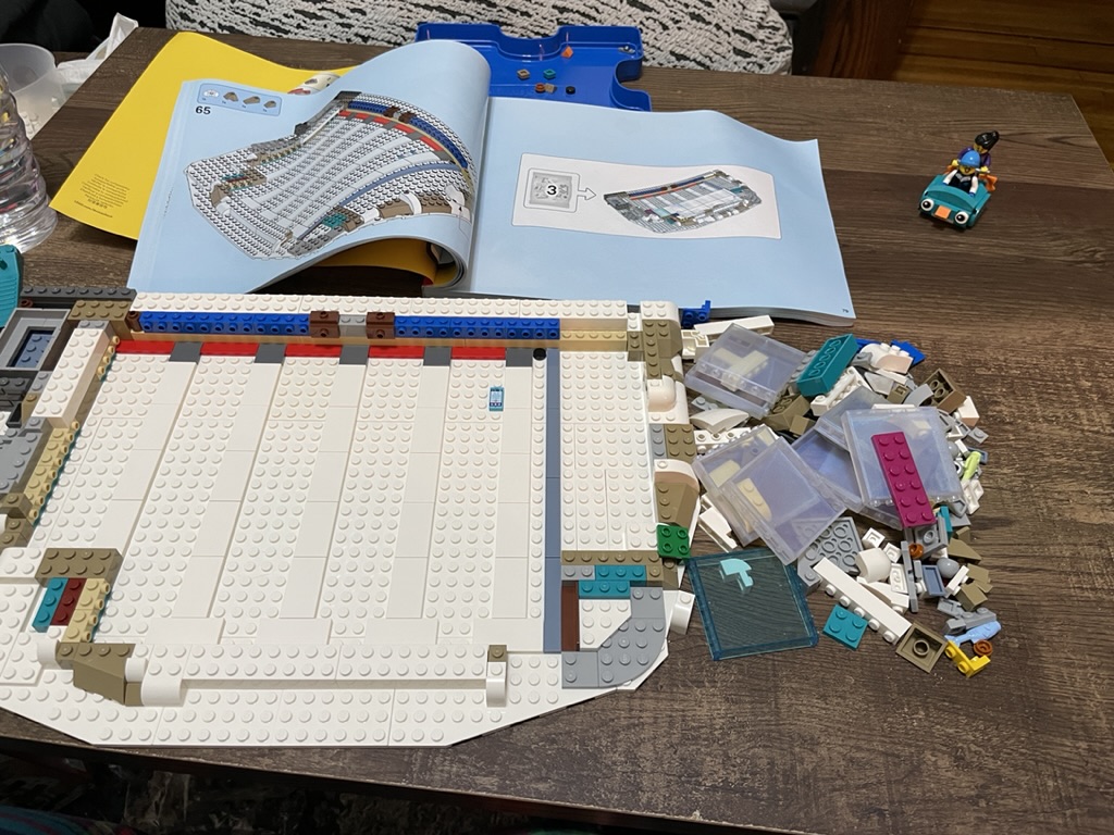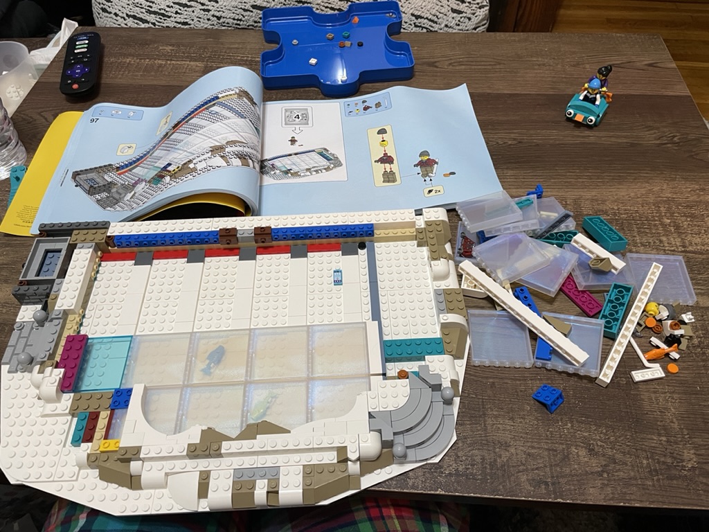 After laying all the ice and the rink’s perimeter, the next few bags add more detail to the base. The initial work is to curve the edges of the rink. This is done by laying small builds flat to create smooth sides. One plus about this build is using the rink to hold the pieces. This prevents my cats from knocking them onto the floor.