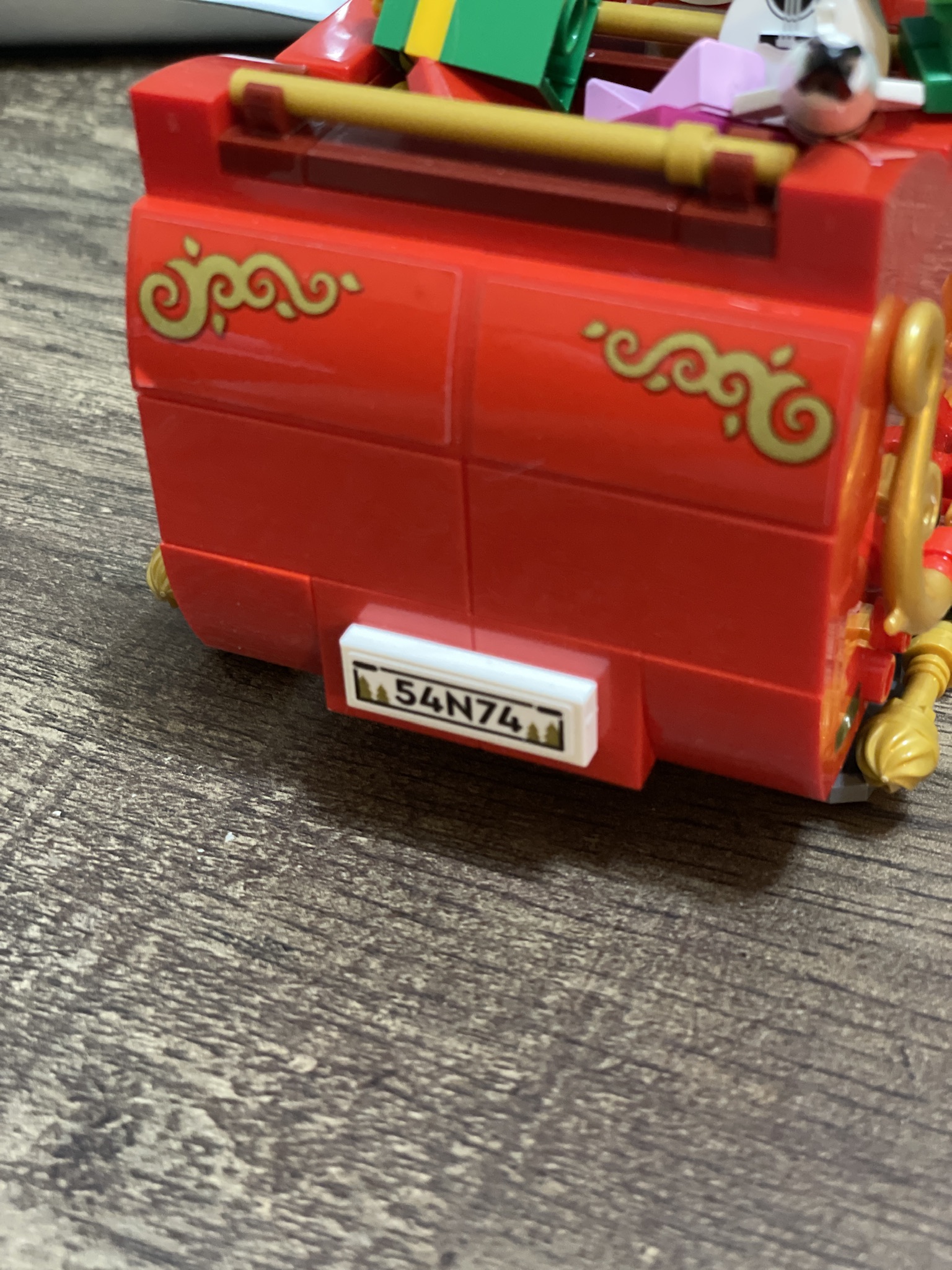 Visually, the sleigh is on point. The contrast between the red and gold parts is a classic Christmas combination. Additionally, the subtle green trim at the bottom of the chassis elevates the design, as it uses the same color scheme as the front sticker. The metallic gold decorative elements enhance the design to give Santa the luxury vehicle he needs for a long night of deliveries.