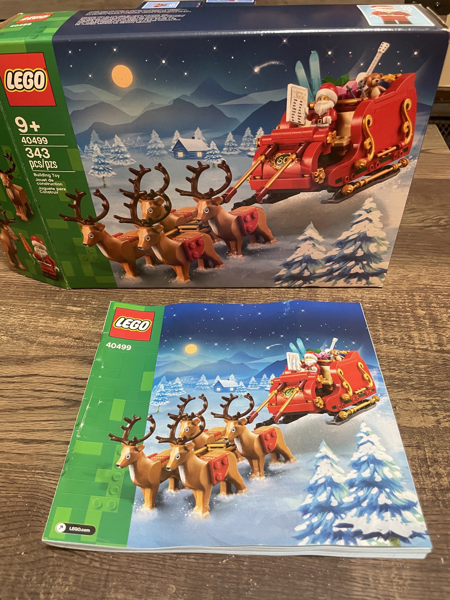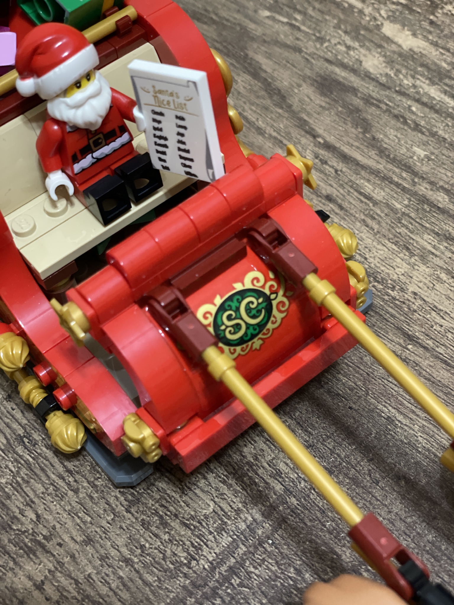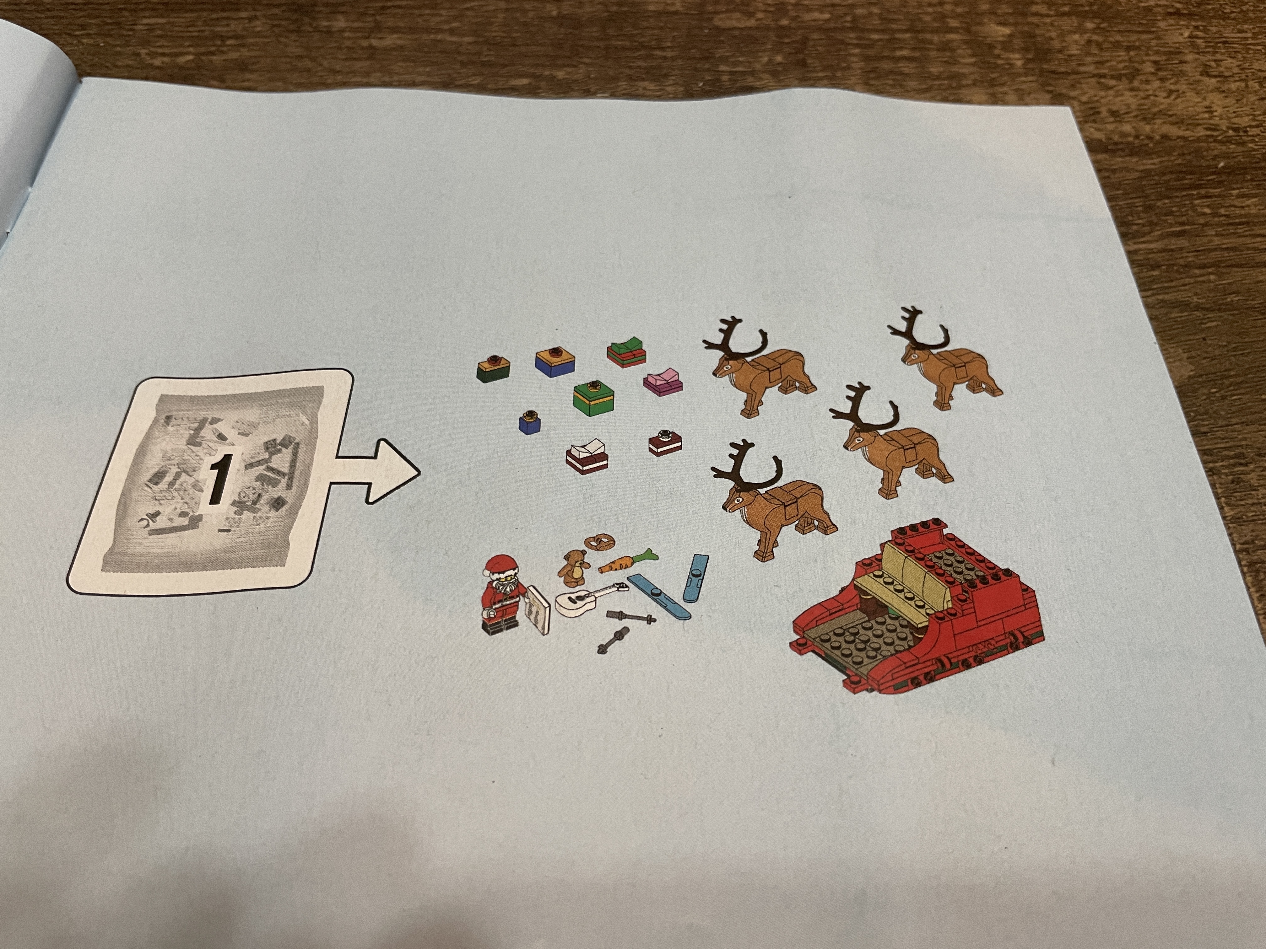 The build has two stages, described in a 76-page instruction booklet. During the first stage, most of the build is completed with the creation of the Santa minifigure, presents, reindeer, and the shell of the sleigh chassis. The second stage focuses on details – reigns, the sleigh exterior, and all the decorative elements.