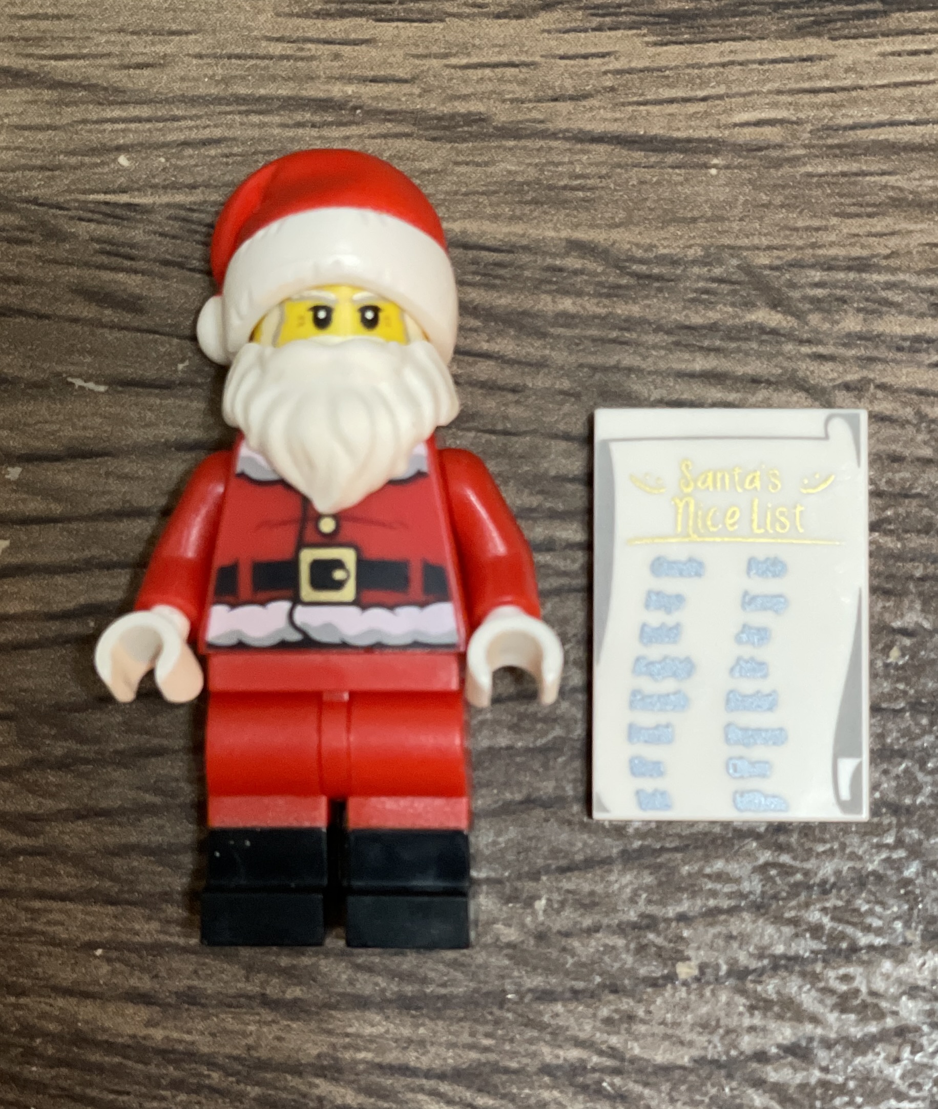 I adore the Santa Claus minifigure. His torso is printed on the front and back, and I like the detail that he is keeping a candy cane in his belt for later! His legs are dual color, acting as the pants and boots. His hat and beard are lovely, detailed additions too. Finally, he comes with a Santa’s nice list print piece containing sixteen lucky children’s names.
