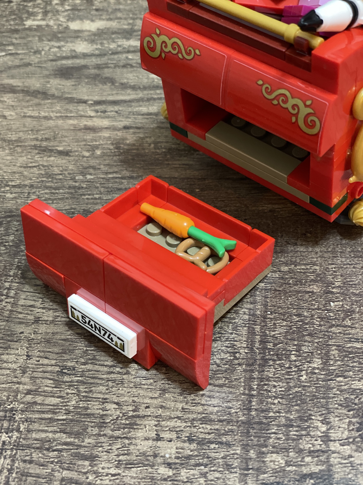 A hidden feature of the set is a boot in the sleigh that houses treats for the reindeer! The compartment hides below the presents and slides in and out without resistance due to tile pieces. Inside, there is room for a pretzel and a carrot.