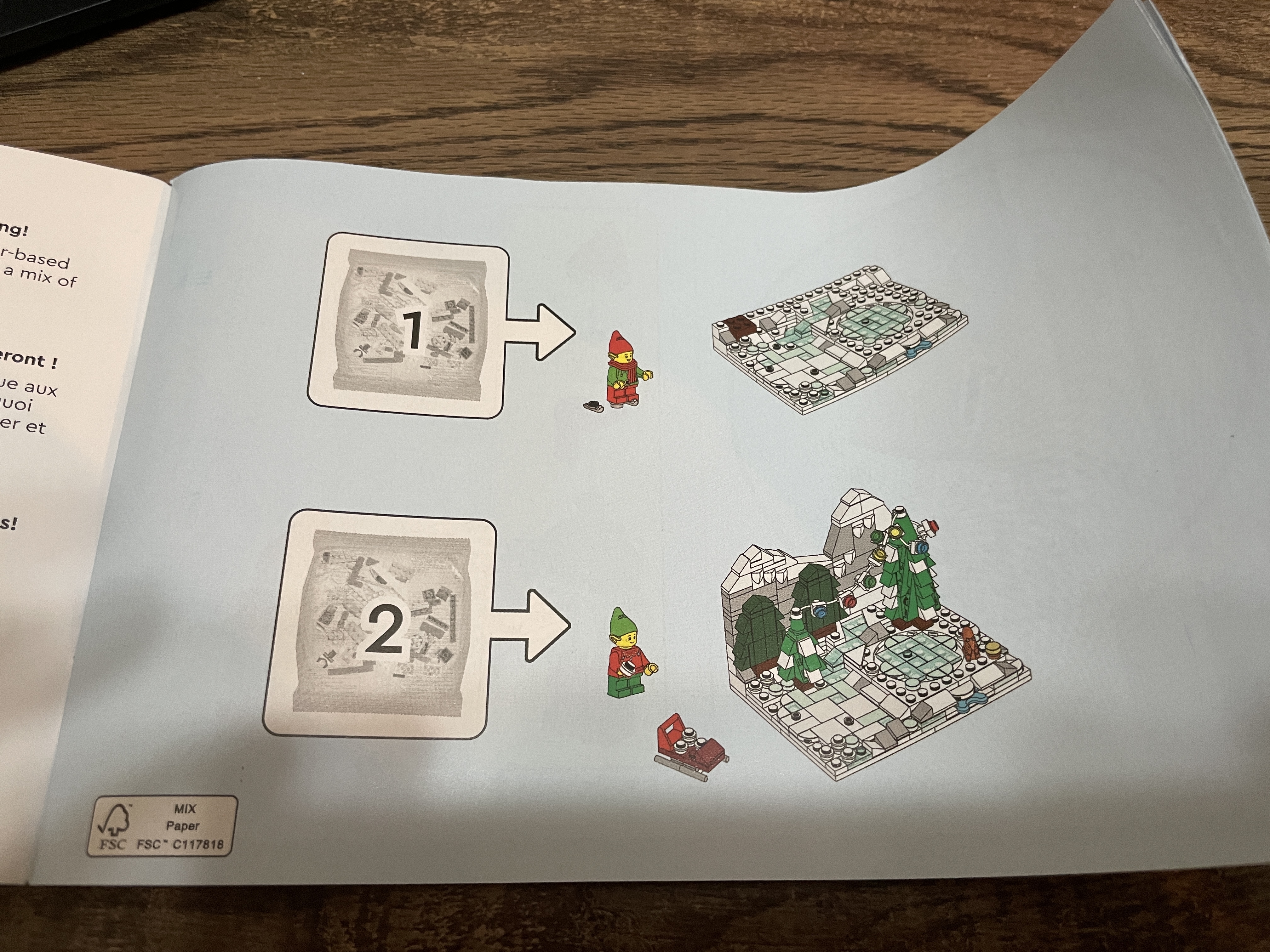 There are two building stages described in an 84-page instruction manual. The first section builds the base and an elf minifigure. The second half of the build constructs the vertical elements – trees, landscape, and the second elf with their sled.