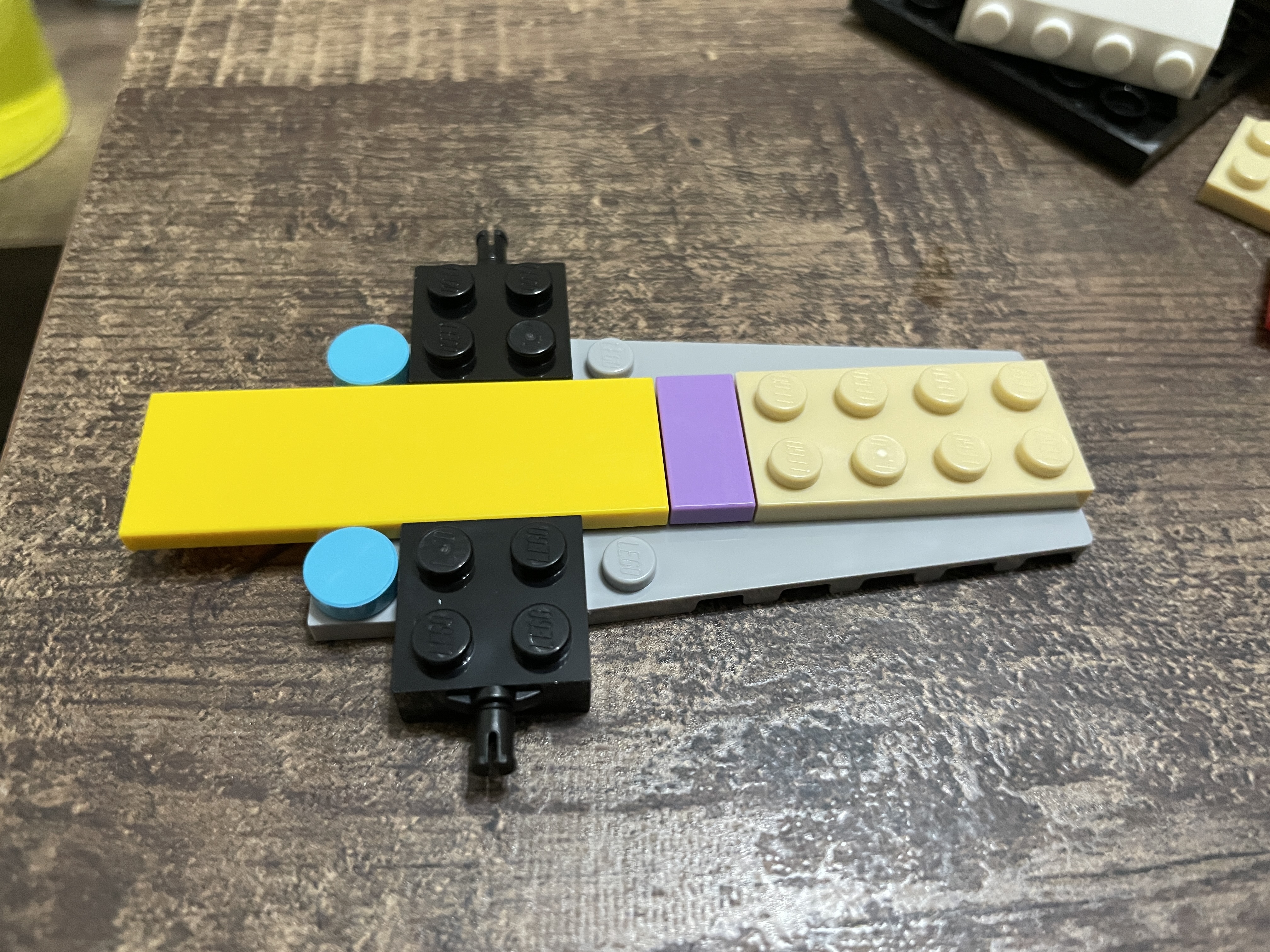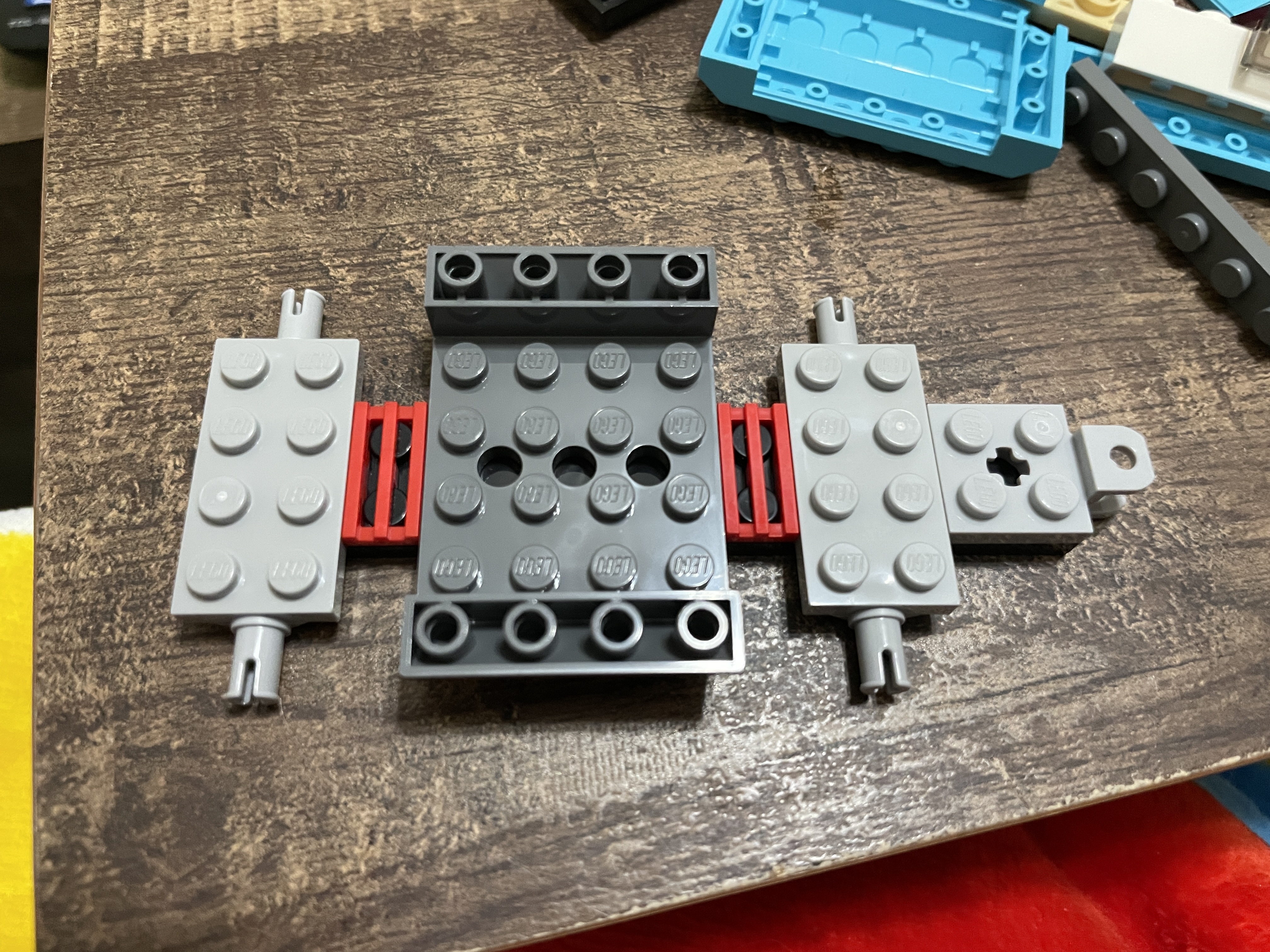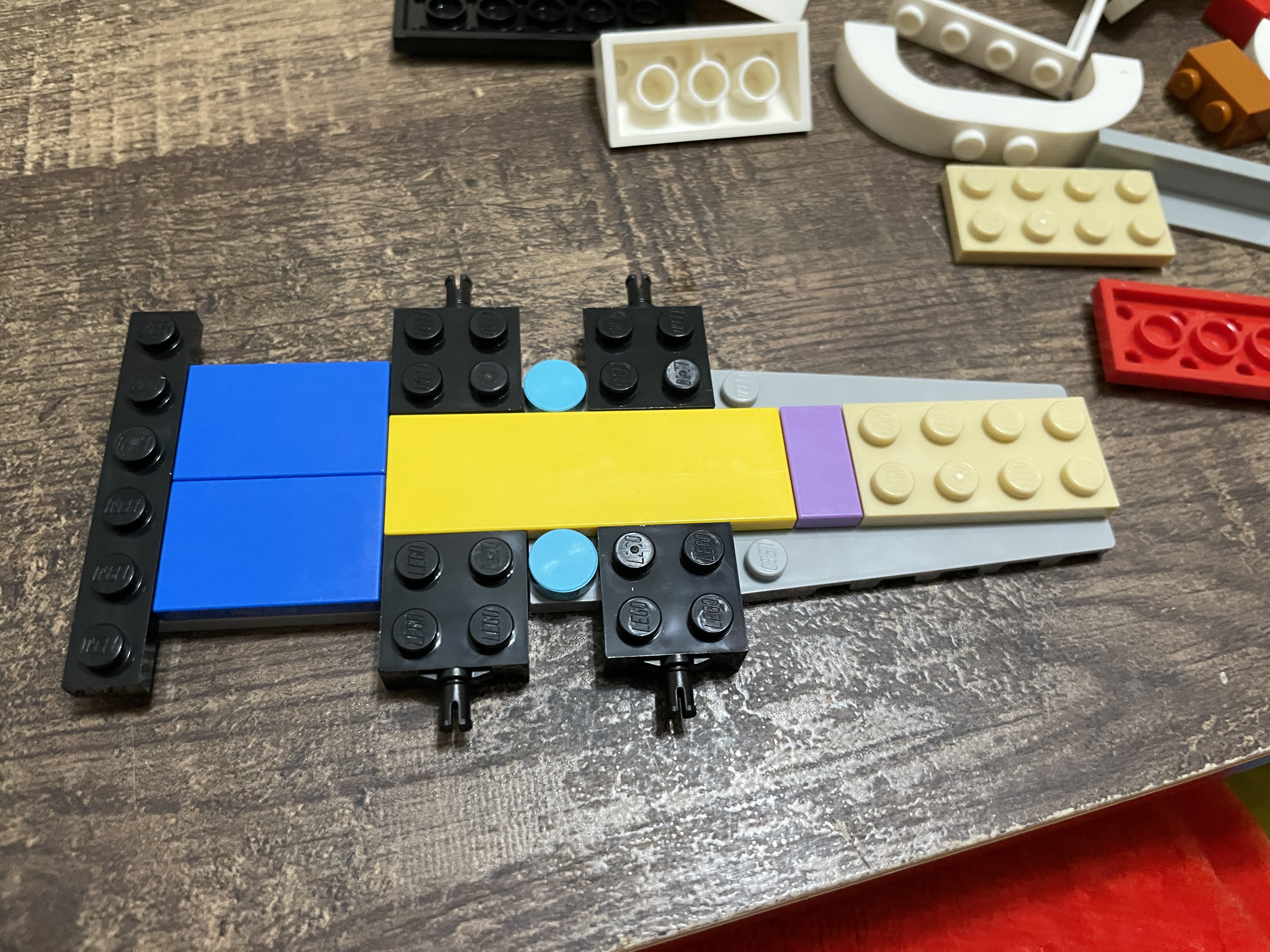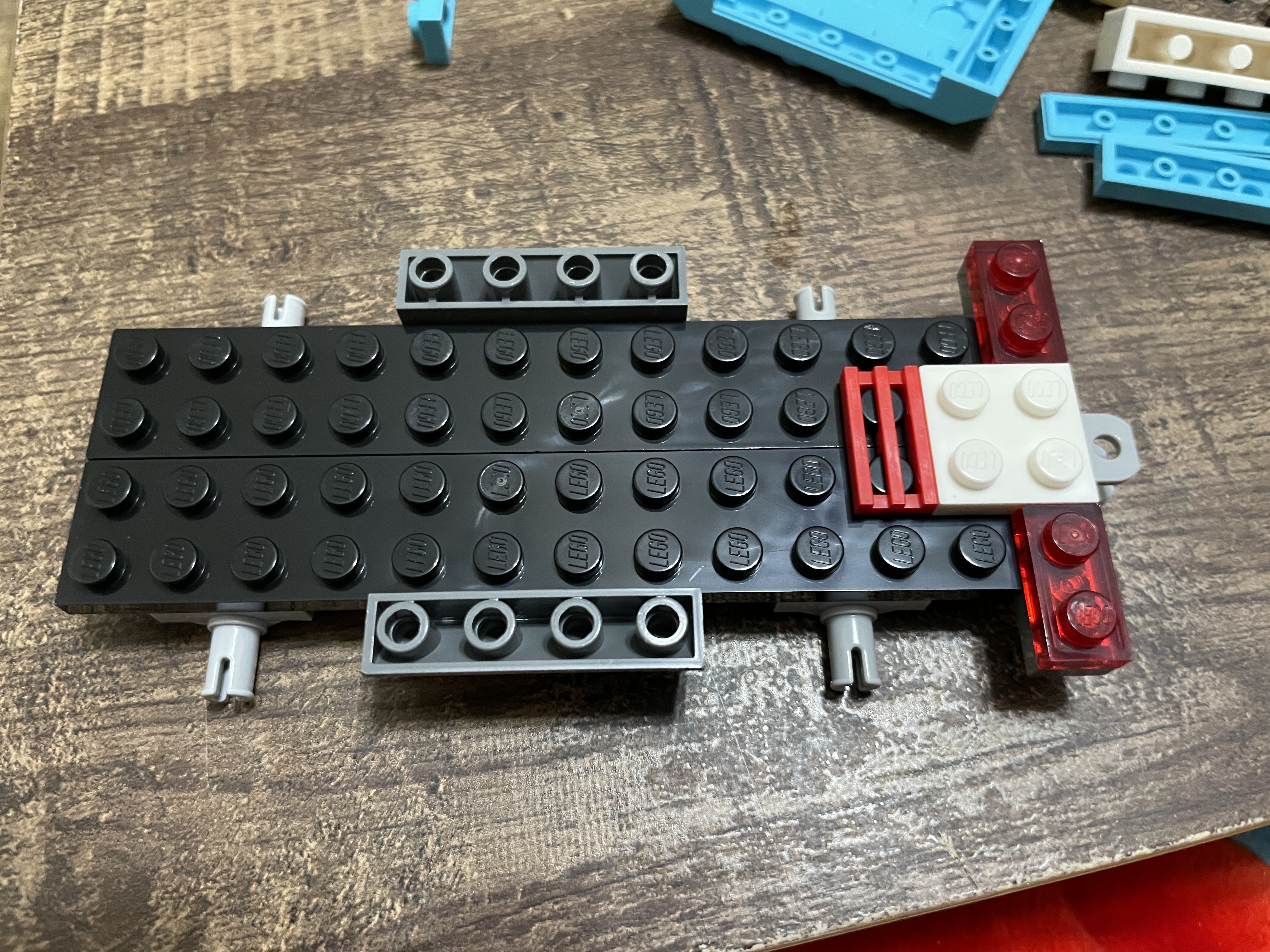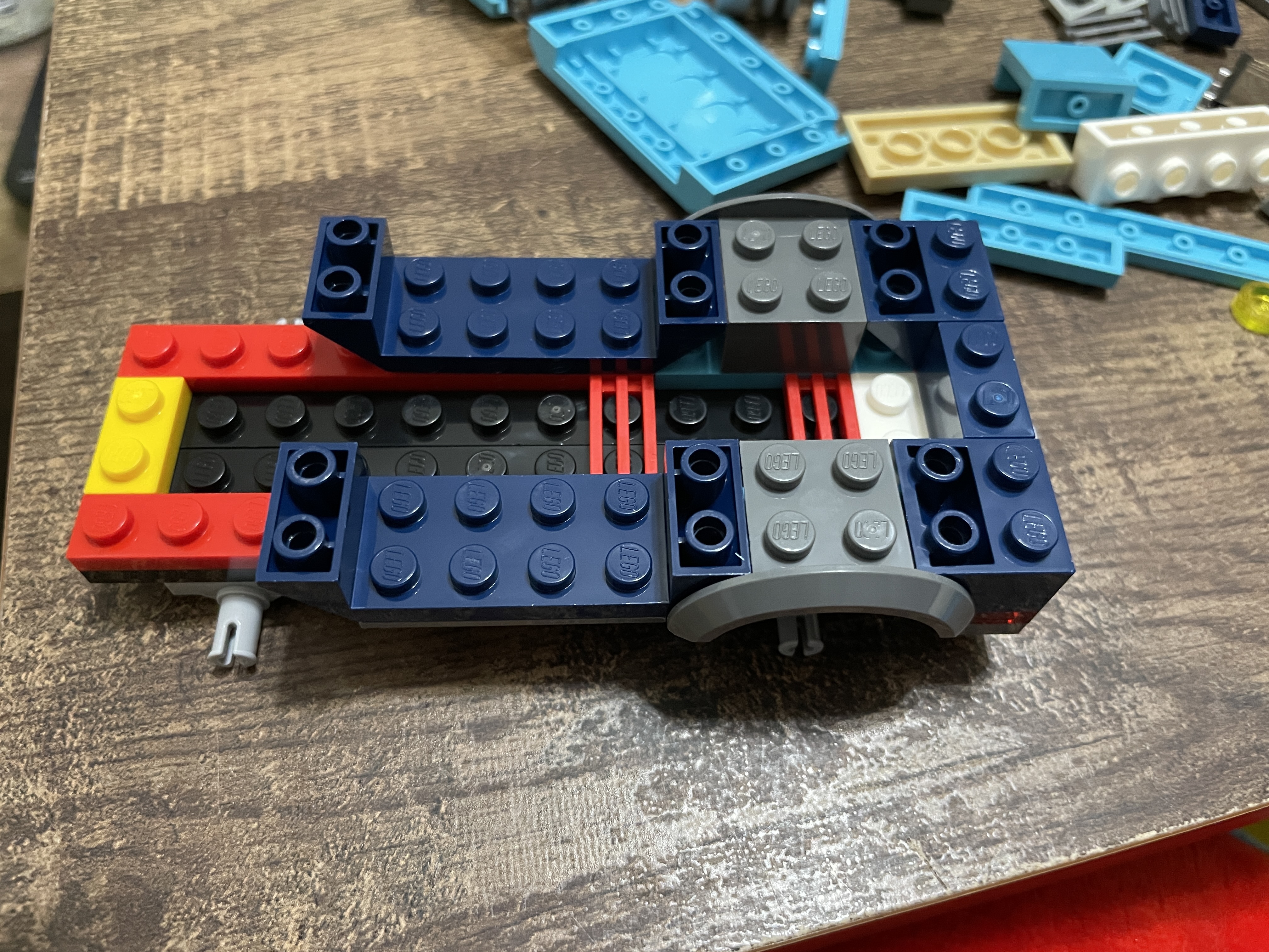 The transporter build starts just like the SUV – with the base first. The two axles are centrally located, and colorful pieces are applied for the internal sections.