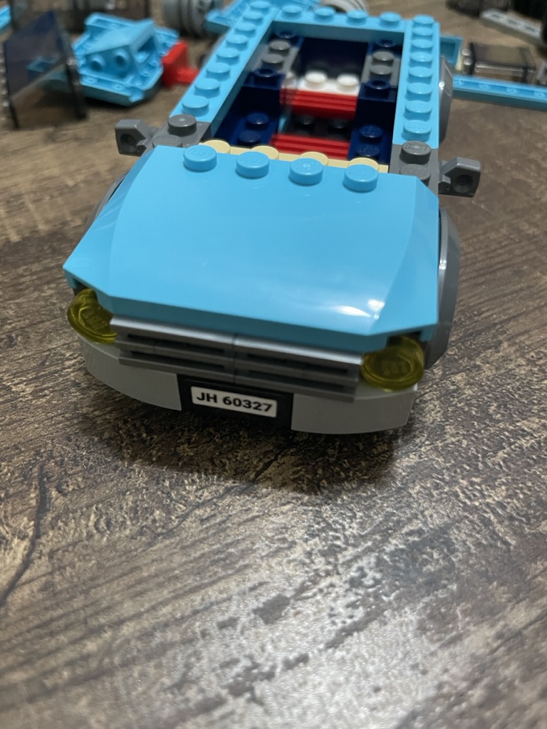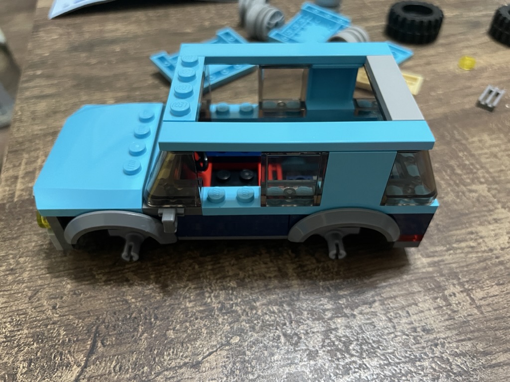 The vehicle moves well, and the connection to the trailer is sturdy and will hold up to me dragging it around. The SUV’s top is held on with one row of studs, so it is easy to remove and put in the minifigs. The cabin space does fit both!