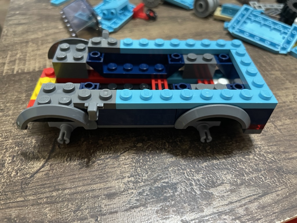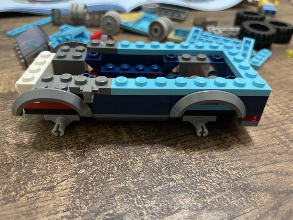 Next, the wheel coverings are added, which brings the vehicle to life. The addition of dark blue elements starts to shape the model’s exterior. The choice of medium azure bricks makes the color combination pop. I love this bright blue – it looks fresh and exciting and will look fantastic in the green areas around the city.