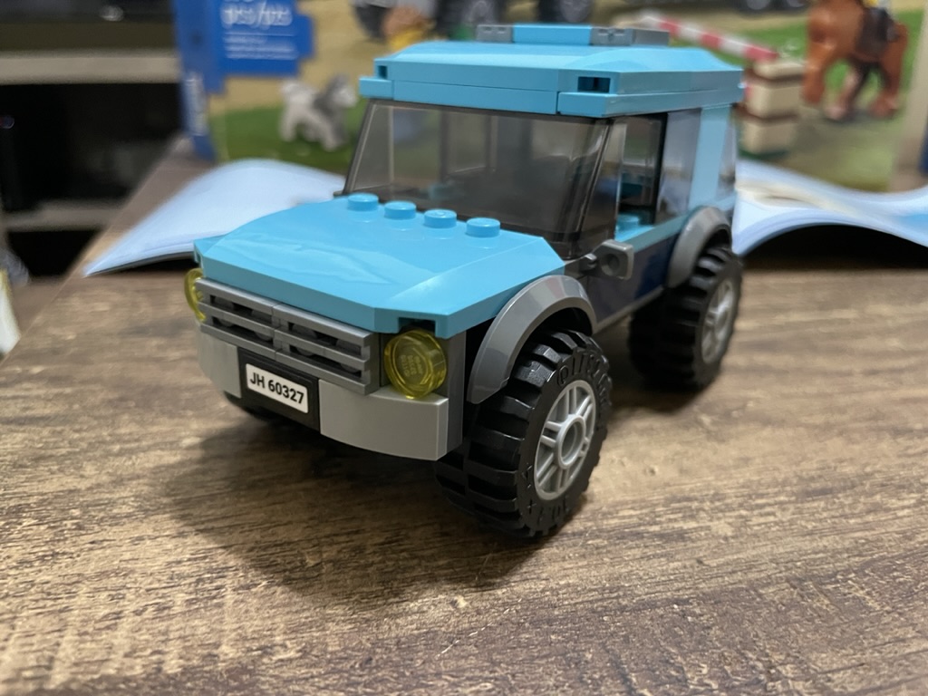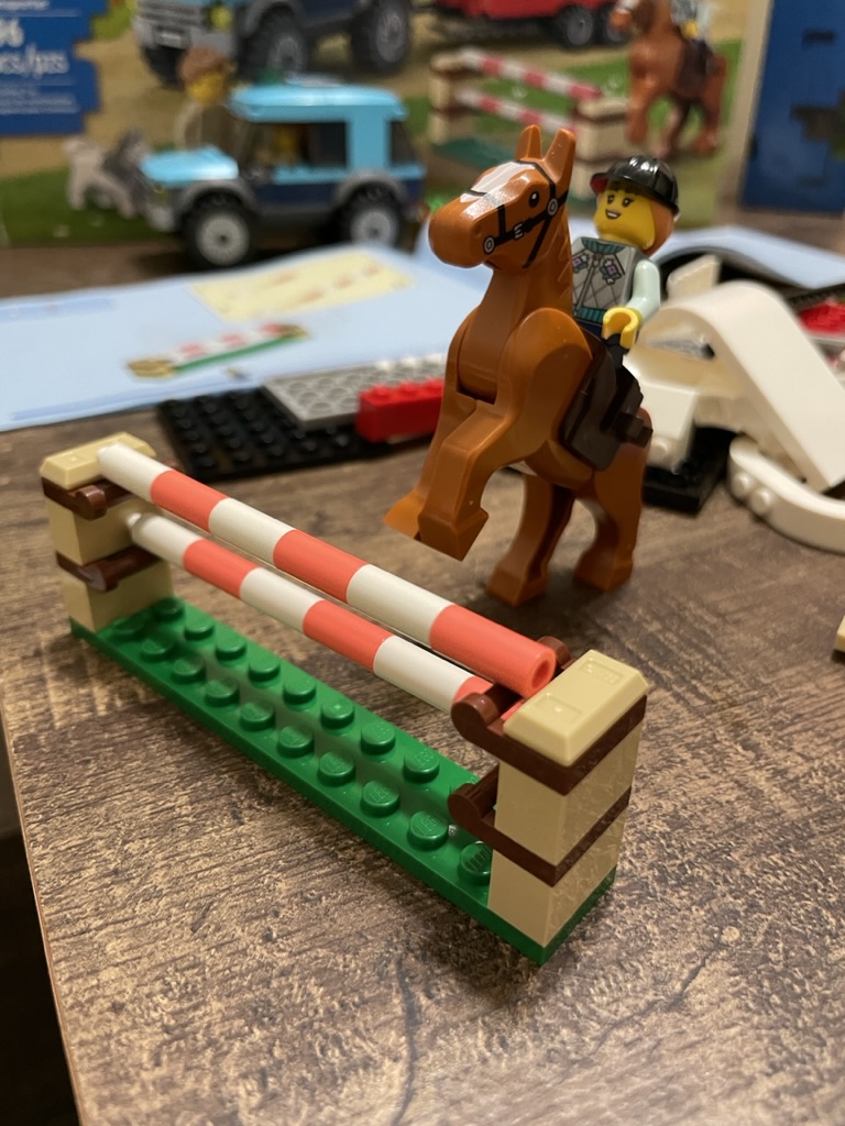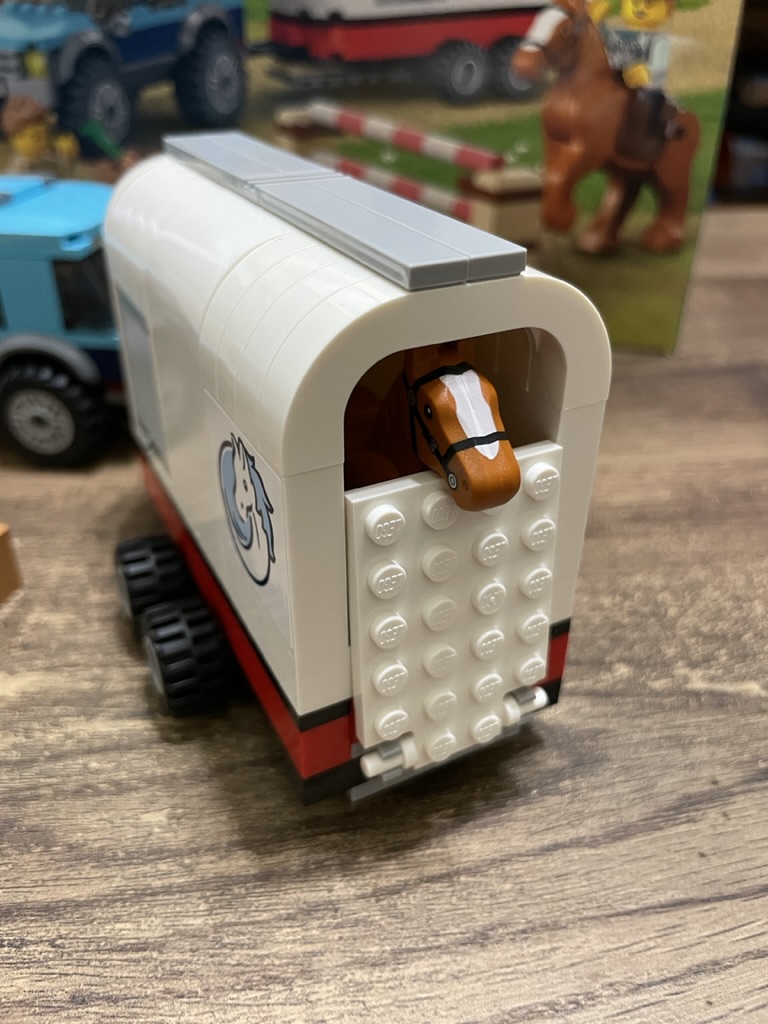 The vibrant blue with the white transporter look fantastic together and could sit on a road, a stable, or by some city grass. The horse is possible in many positions, as I’ve shown in my photographs, so you can make this set look however you’d like. That kind of customization isn’t always possible, and it’s how city-themed sets can stand out. The little jump is the start of a larger area if you like – get a few more horses, and suddenly you have a show!
