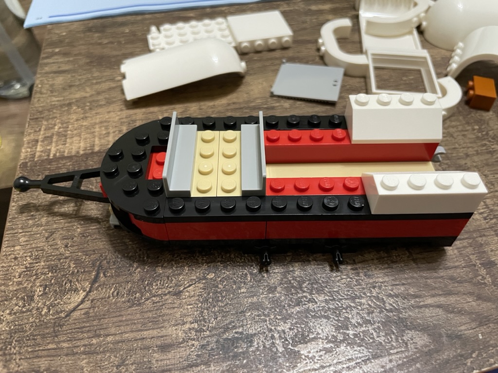 With the ball connector in place, the details of the transporter start to take shape. First, a storage area is generated at the front of the transporter (need to keep hay and carrots somewhere!) before the shell is added. Red, white, and black are the colors of my favorite sports team, so naturally, I like the color choices used here.