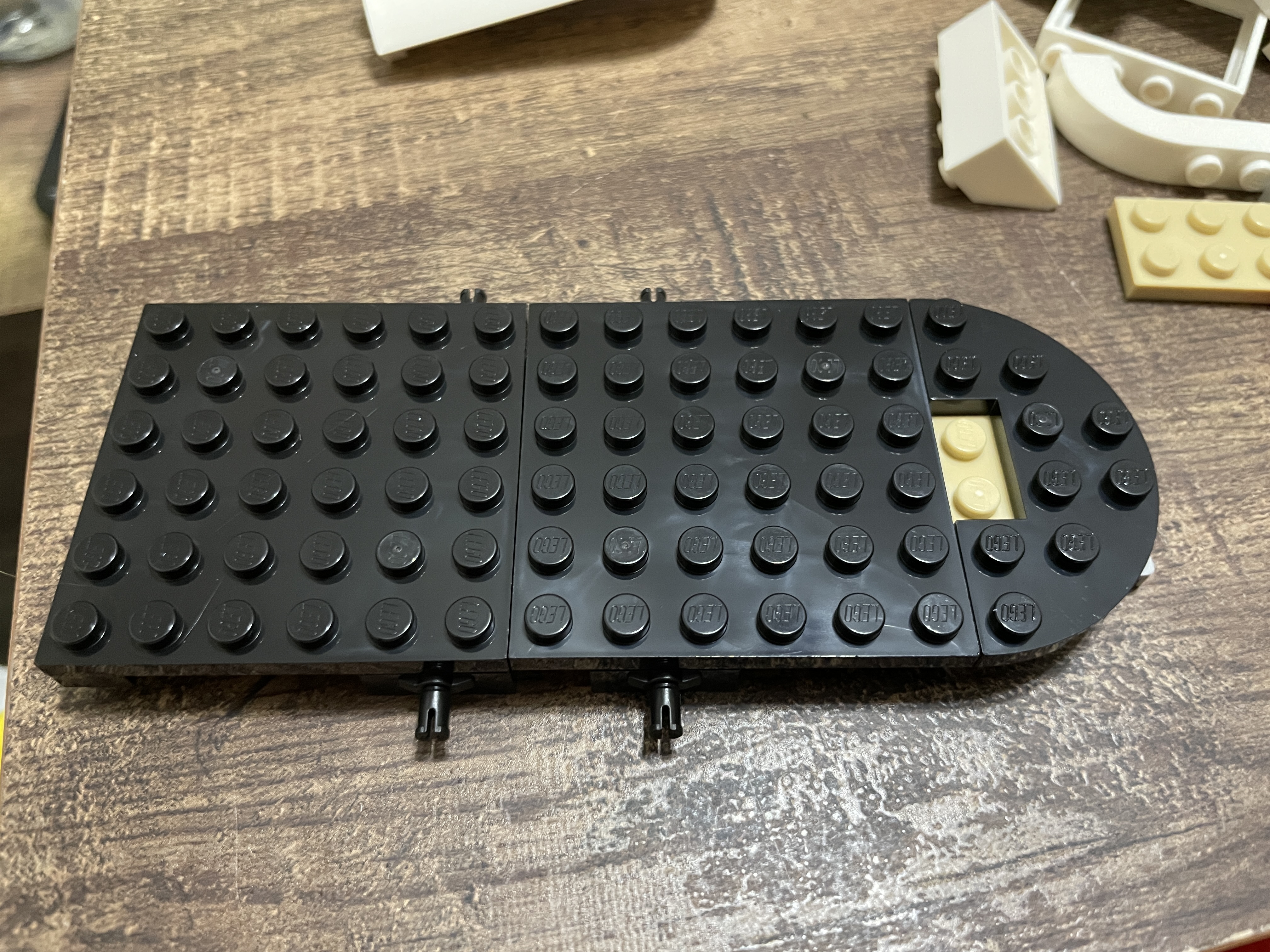 Once the basic structure is in place, it is covered in black tile for the base of the transporter. Now the entire footprint can be seen, with a rounded front and straight back to let the horse in and out. Red bricks and tiles are added to form the beginnings of the internal structure.