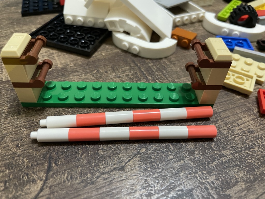 Time to build the final accessory, which is the little jump. It is straightforward yet effective. The poles are stacked candlesticks that rest on the bars. They’re realistic, too, as the lightest touch will knock these off – a fact my cat takes immense pleasure in proving. You can pose the hose and rider to look like they’re about to take off for a jump.