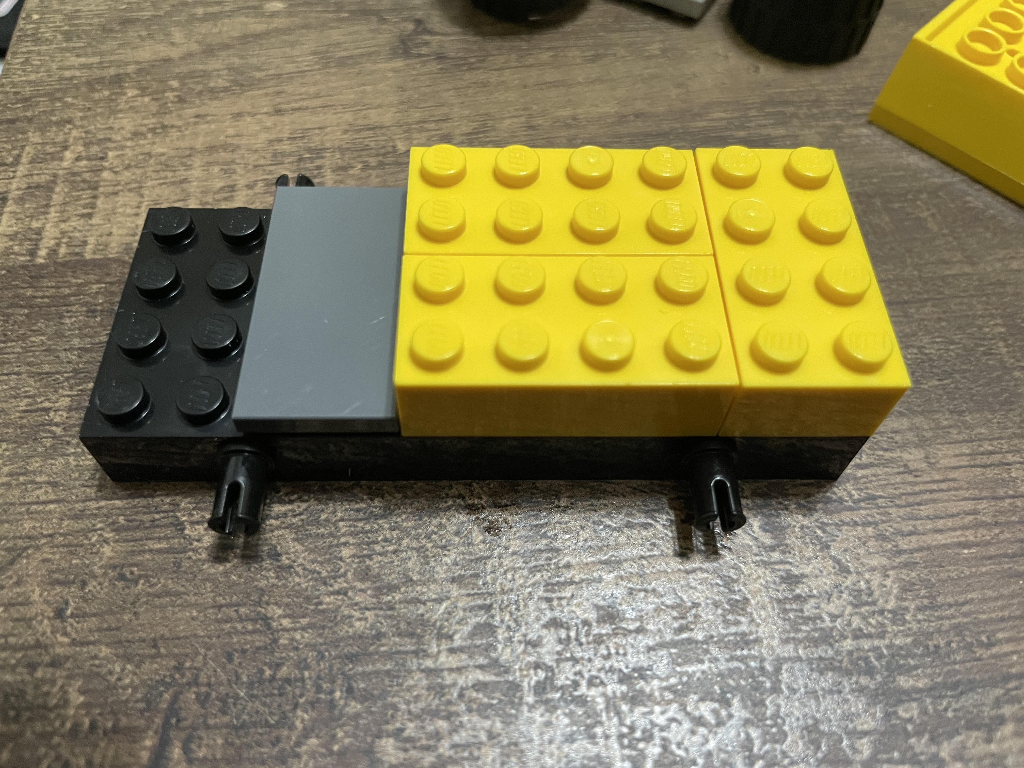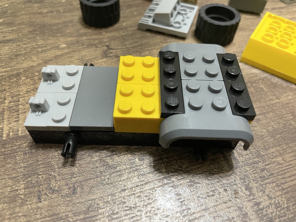 To begin the vehicle’s construction, the large black base with integrated wheel axles is used. Onto it, three 4×2 yellow bricks are arranged, with a 2×4 dark grey tile placed next to it. On top of the yellow bricks, light grey wheel coverings are added to protect the rear wheels. At the front of the vehicle, two modified 2×2 plates are placed that will act as the anchor for the tipping bucket. The truck’s rear receives elevation via two modified 2×2 bricks and two 1×2 plates with clips. As this is a short build, you can already see the roadwork truck taking shape with these foundation pieces in place.