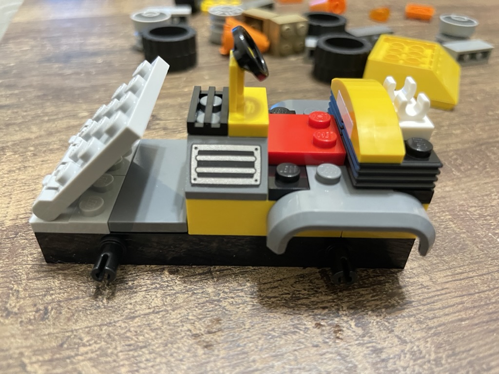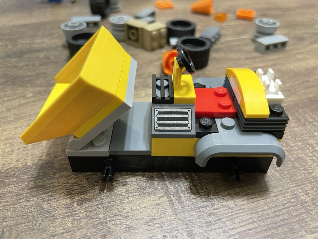 Quickly, details are added to the build. First, a 3×4 hinged light grey plate sits at the front of the vehicle; this is where the tipping bucket will attach. Printed 1×2 wedges with a grate design sit on either side of the steering wheel. A curved, 1×4 yellow tile piece creates the driver’s backrest. The truck begins to look complete when the bright yellow tipping bucket is in position. The playability of this element is seamless, with no resistance when moving the bucket. The hinge design allows the bucket to be placed at any desired angle, maximizing play and display possibilities.