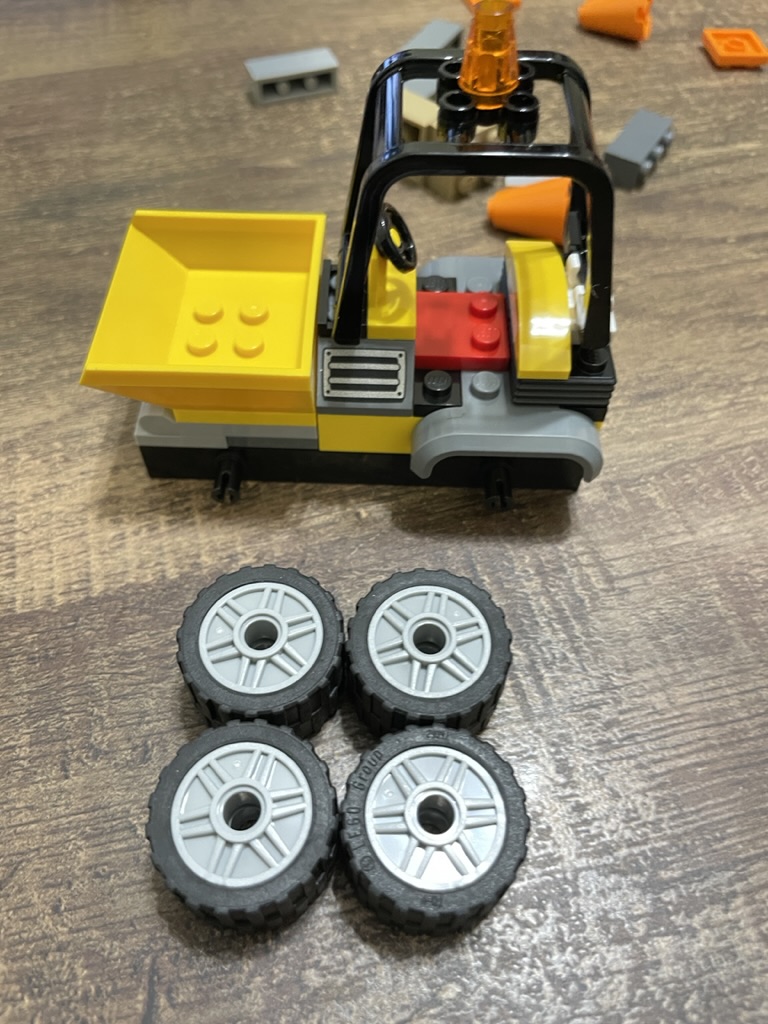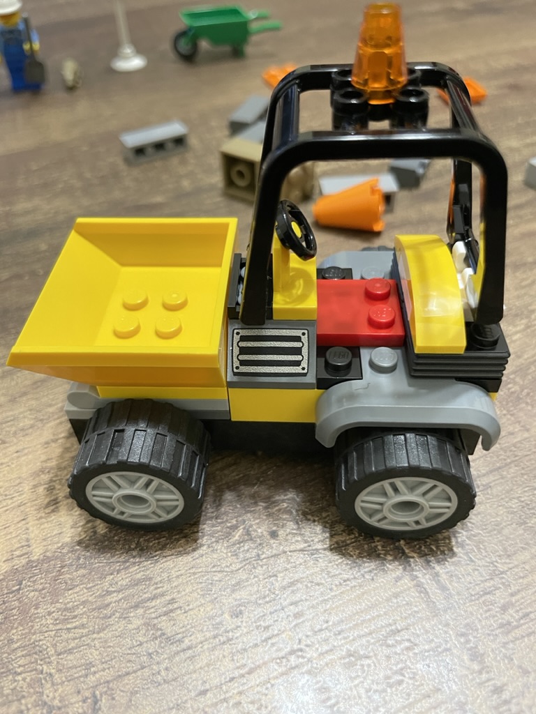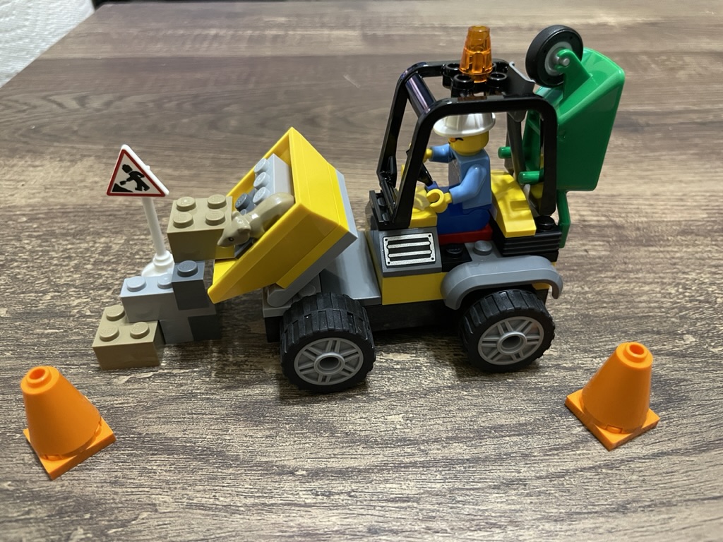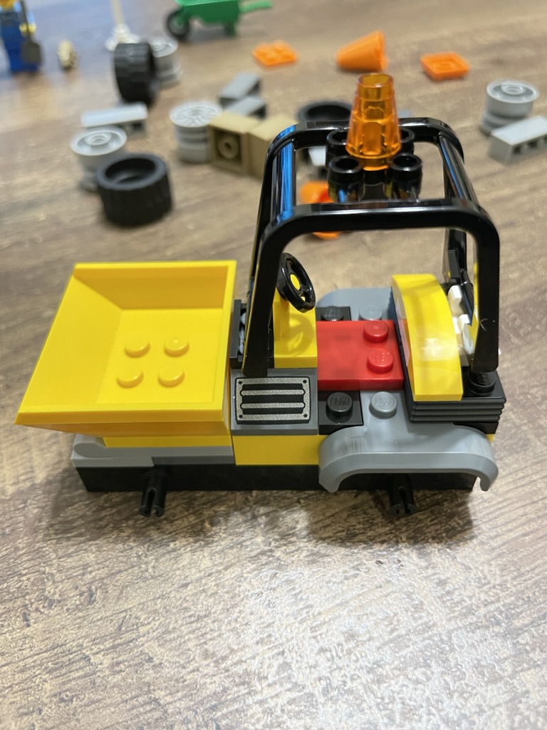 The set comes with a few other accessories, including orange pieces that make roadwork cones and several bricks to act as construction material. I had a lot of fun arranging all the extras into little scenes. I even managed to attach the wheelbarrow to the back of the cage so the roadworker could take all their tools with them!