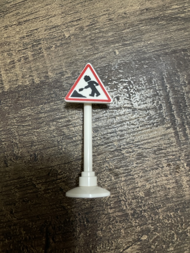 The single minifigure is the first part of the build. They have worker’s printing that has been part of the city line-up for years, so nothing unique there. The face is single-sided and is designed with a slight smile and protective eyewear. To complete the look, they wear a white hard hat and have a shovel as an accessory. Next are the two mini builds for the set – a roadwork street sign and a green wheelbarrow.