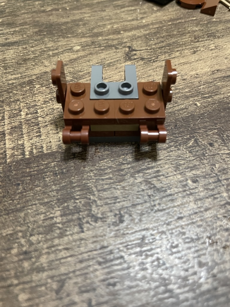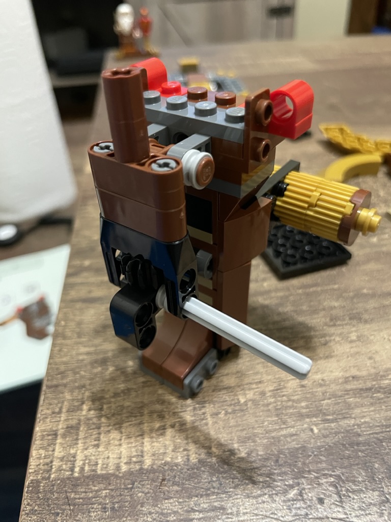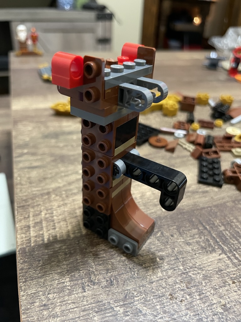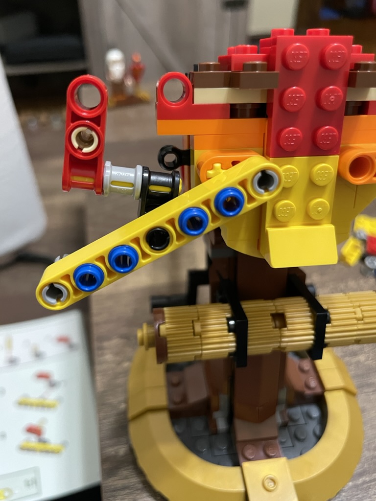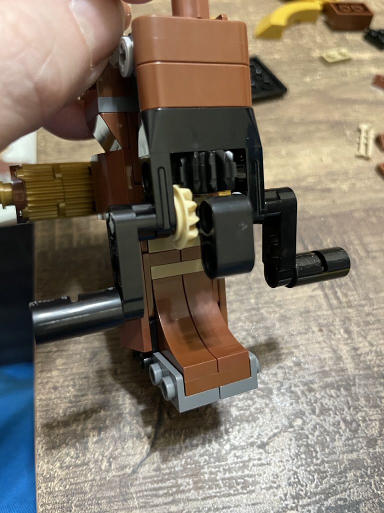 The perch is created by stacking gold, grooved, cylinder bricks, using an axel to hold them together. It is attached to the shaft via a technic plate and polished with a dark reddish brown 2×2 circular jumper with a gold stud. Once that is in place, the mechanism for Fawkes’ wings is the focus.