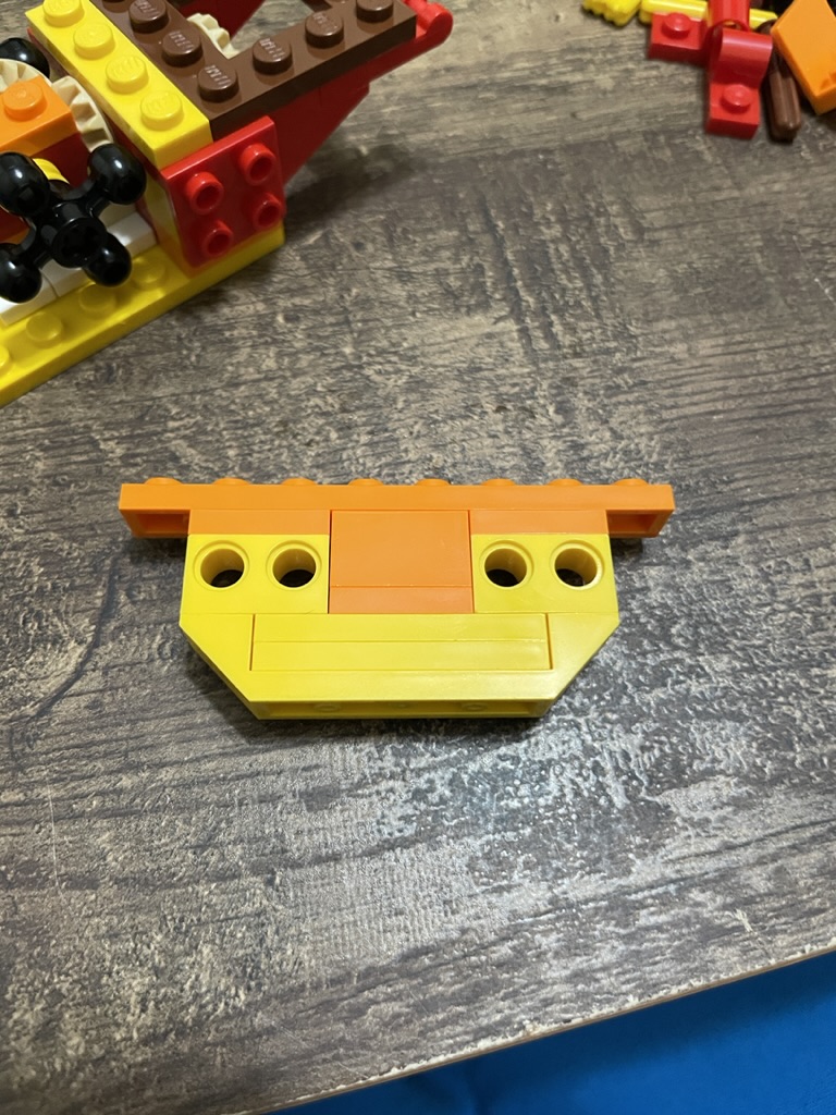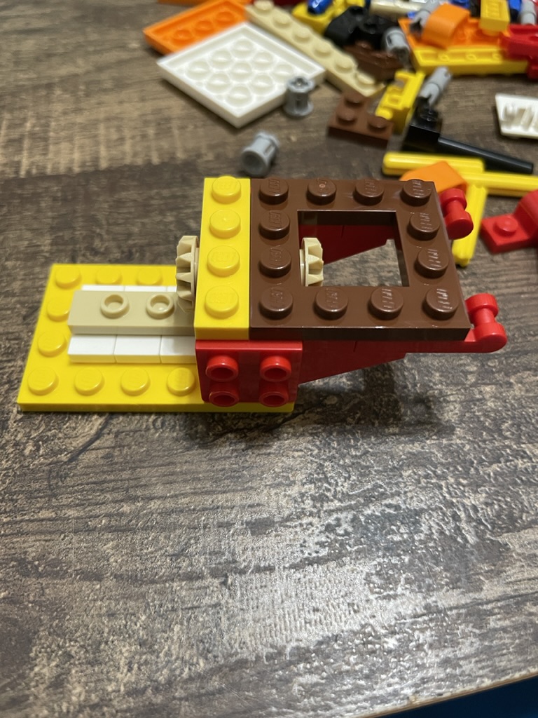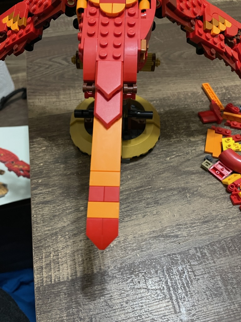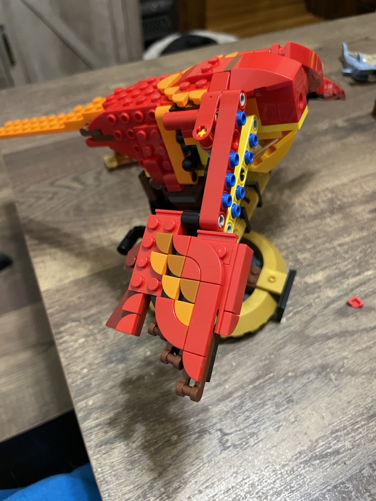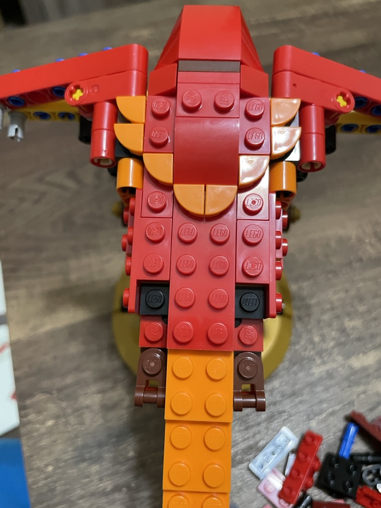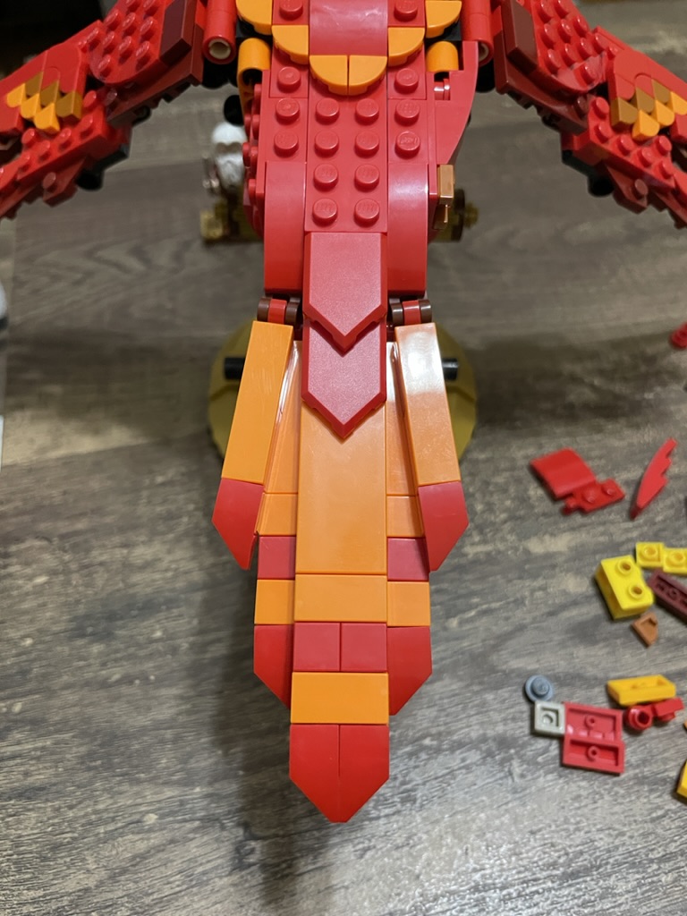 Quickly, the bird’s body comes together, with many technic elements hidden behind the red plate. The combination of red, orange, and yellow is striking. Once the bulk of the body is complete, it attaches to the base, and you can visualize how the model will come together.