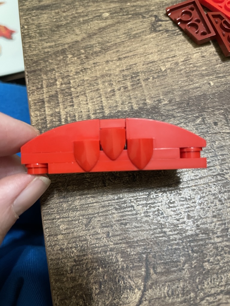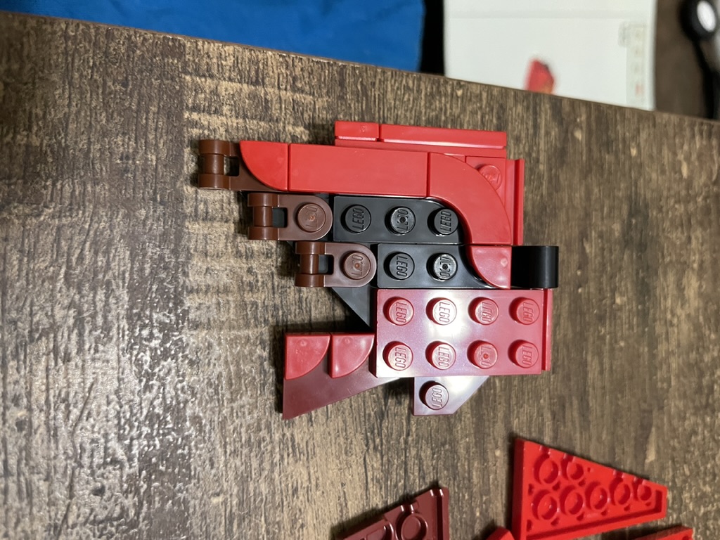Phase three of the build is primarily red and black plate, focusing on covering and decorating the wings. The wings are built with a base of black, dark reddish brown, and red plate. Using quarter-round, macaroni, and straight tile creates a feathering effect with plenty of texture and design depth. Once constructed, these elements clip into place.
