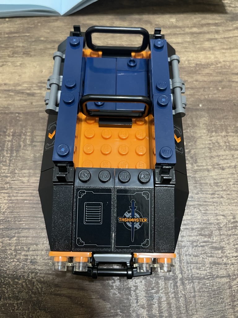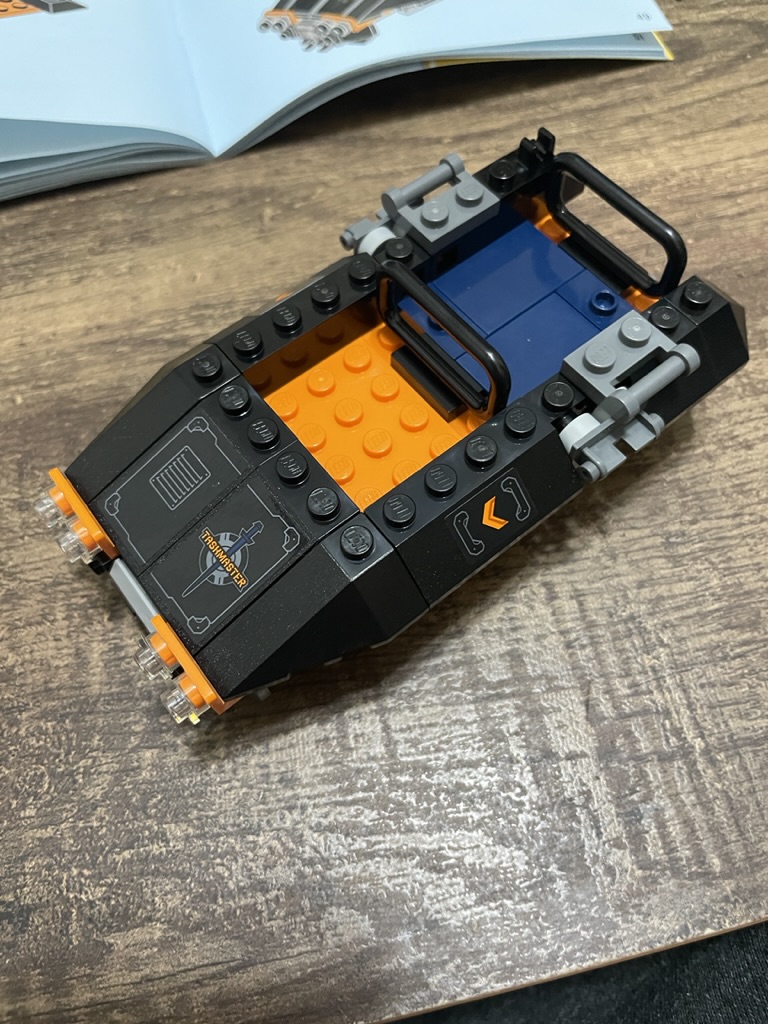 Next, the truck’s cargo hold is constructed, and it looks striking with the color choices of navy blue and bright orange. A couple of jumpers are placed on the floor to allow items to be attached later.