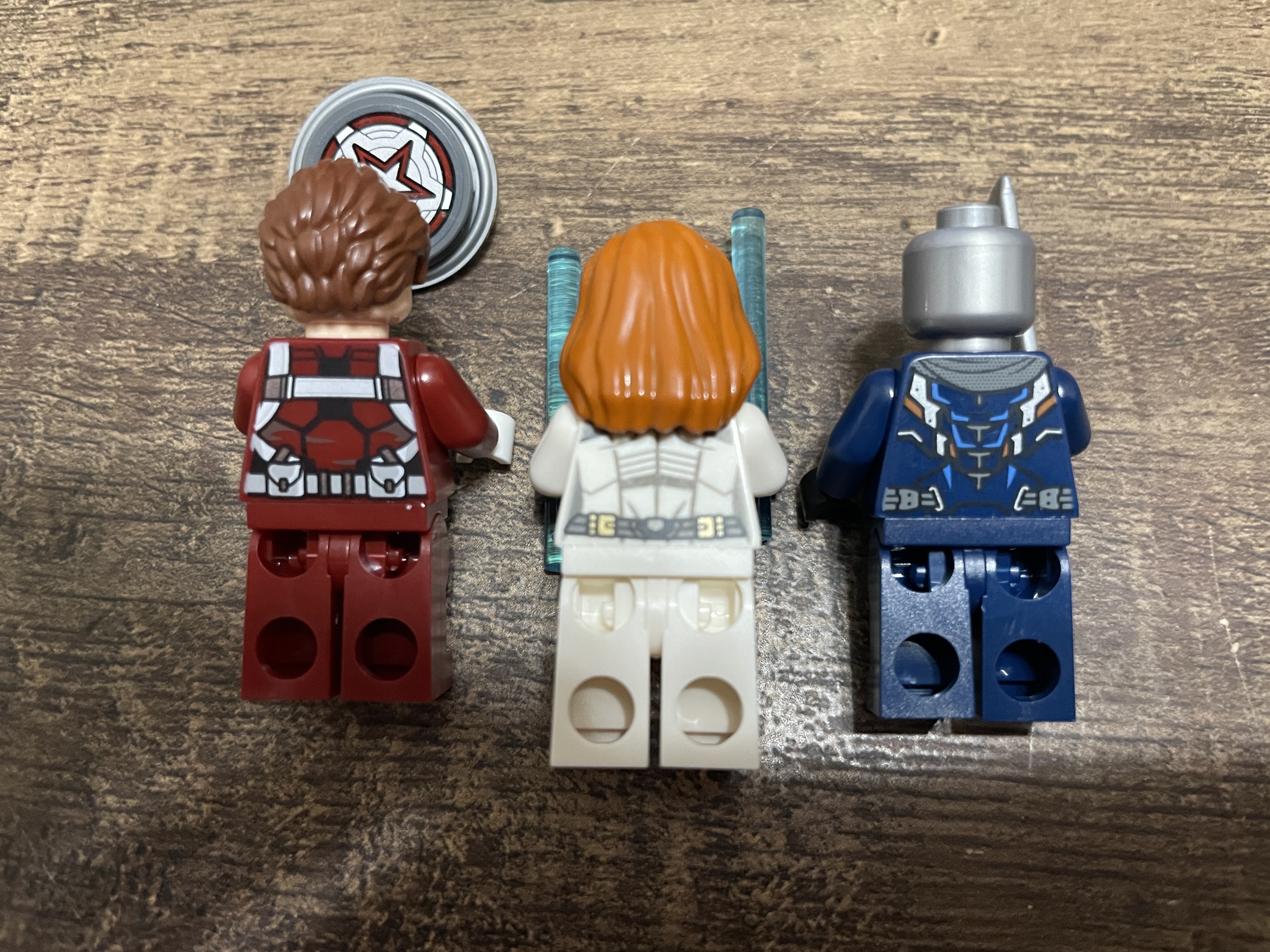 First up are the stars of the set – the three exclusive minifigures. Black Widow is the only figure with leg printing, and the design matches the white suit she wore in her titular movie. She comes with two bright blue batons, which she has never had on screen, but always come with her minifigure. Red Dragon is the most expensive figure in the set, as this is his only minifigure so far. His shield is a mini-build, and that is a sticker on the front. Be careful when placing that! Taskmaster comes with outstanding torso printing and a machete for a weapon.