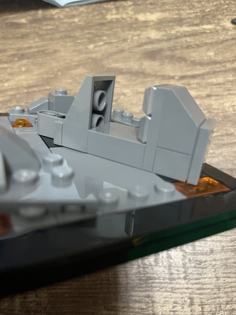 The front aesthetic comes from a couple of black slopes on either side of a silver ingot. Onto that, we add 2×3 black slopes with a couple of stickers. It would be best if you got these aligned perfectly, and adding these was a tense time. With an orange plate as the base, this element locks onto the front of the truck, and the hood is complete.