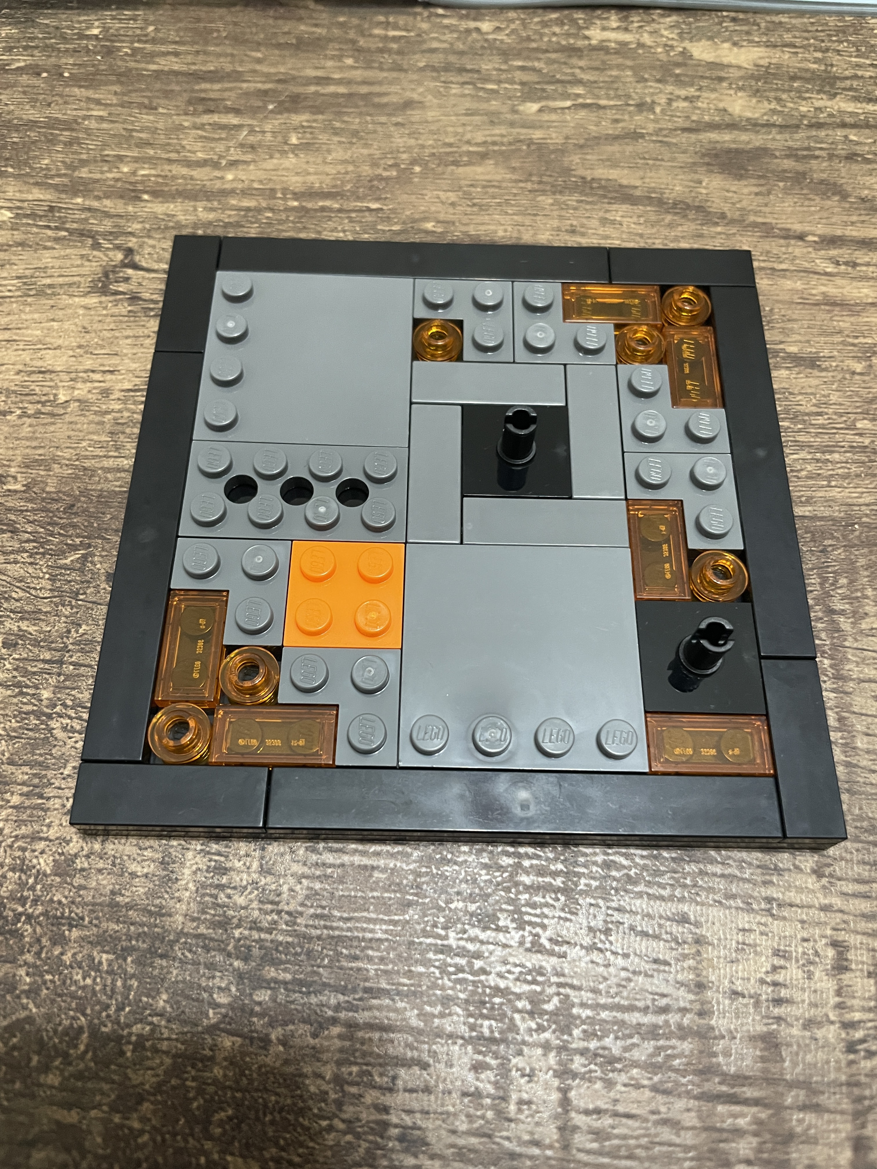 The base is the first section of the build, which the truck will sit on. The design is simple yet effective. The black plate is trimmed with black tile, and transparent orange pieces add design and interest to the base. On top of the black plate, the grey plates, tile, and modified plates are placed. This creates a robust platform. There are also two modified tiles with technic pieces, which will be anchors for the vehicle clip.
