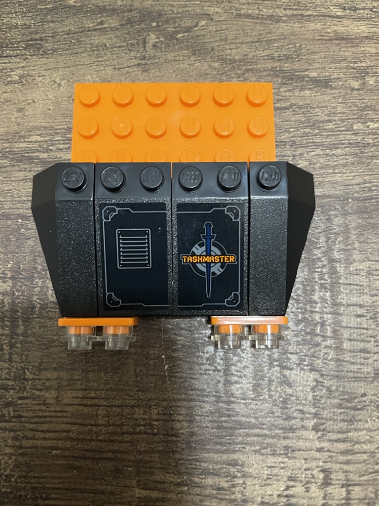 The front section attaches the rest of the build, with black slopes and stickers to maintain the Taskmaster design and the orange accents.