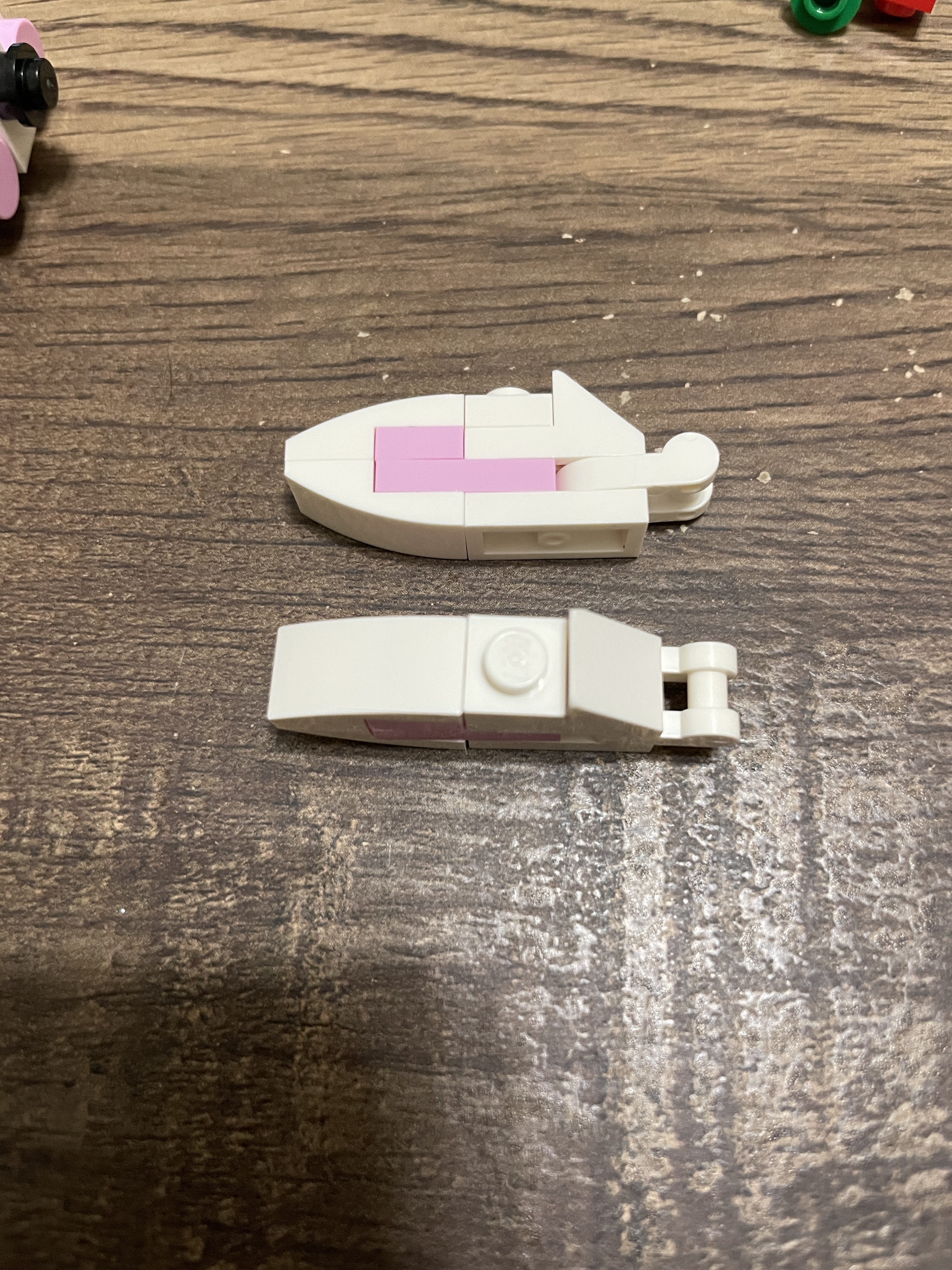 Printed eyes sit above the side profile of the pink plates, and 1×2 wedges are stacked on the sides and the rabbit’s back. On the top is the controversial 1×3 modified plate. Unfortunately, they do not make this piece in white, and the designers opted for it for structural strength. It’s contentious as it doesn’t fit the white rabbit design and stands out.