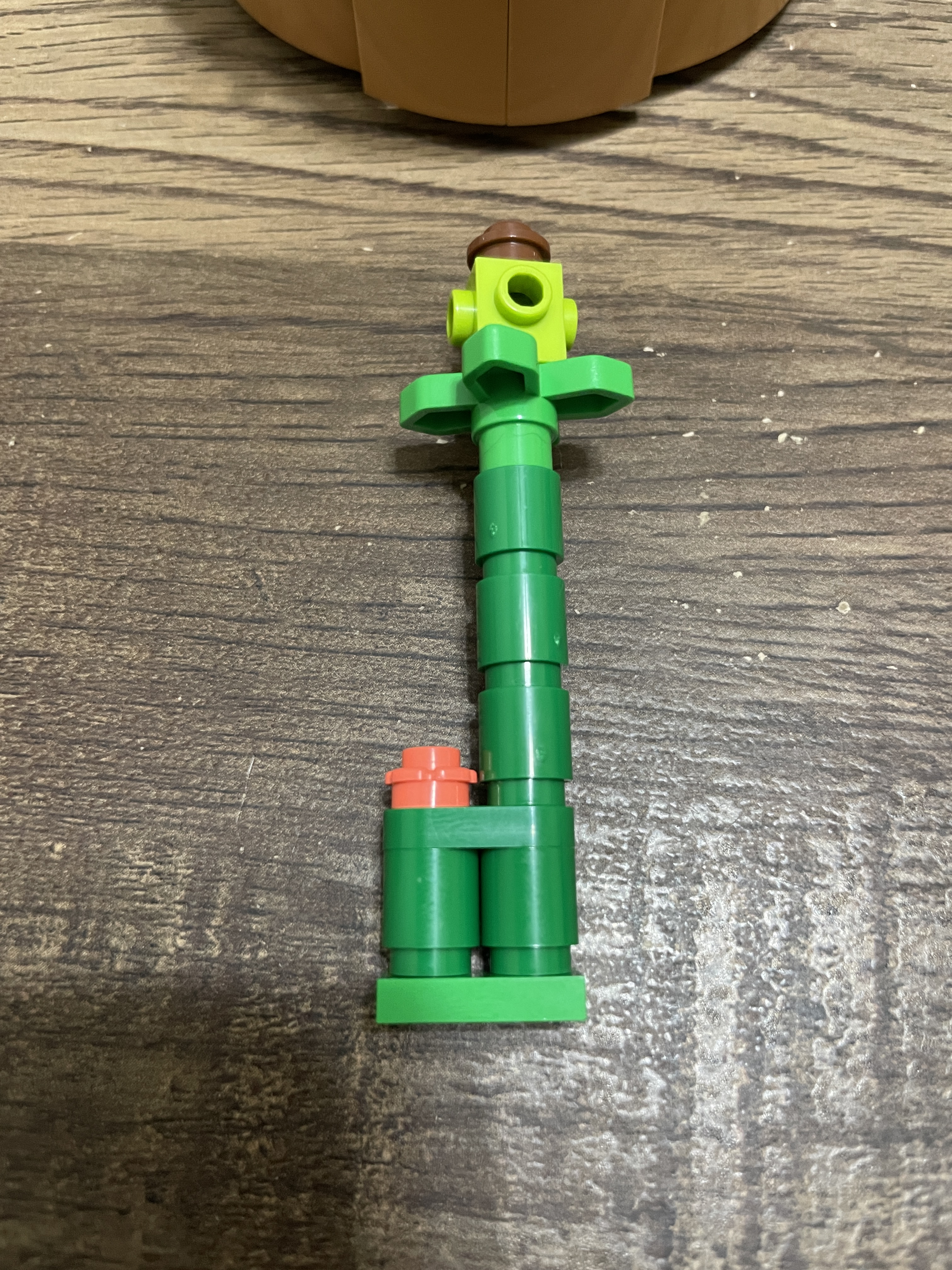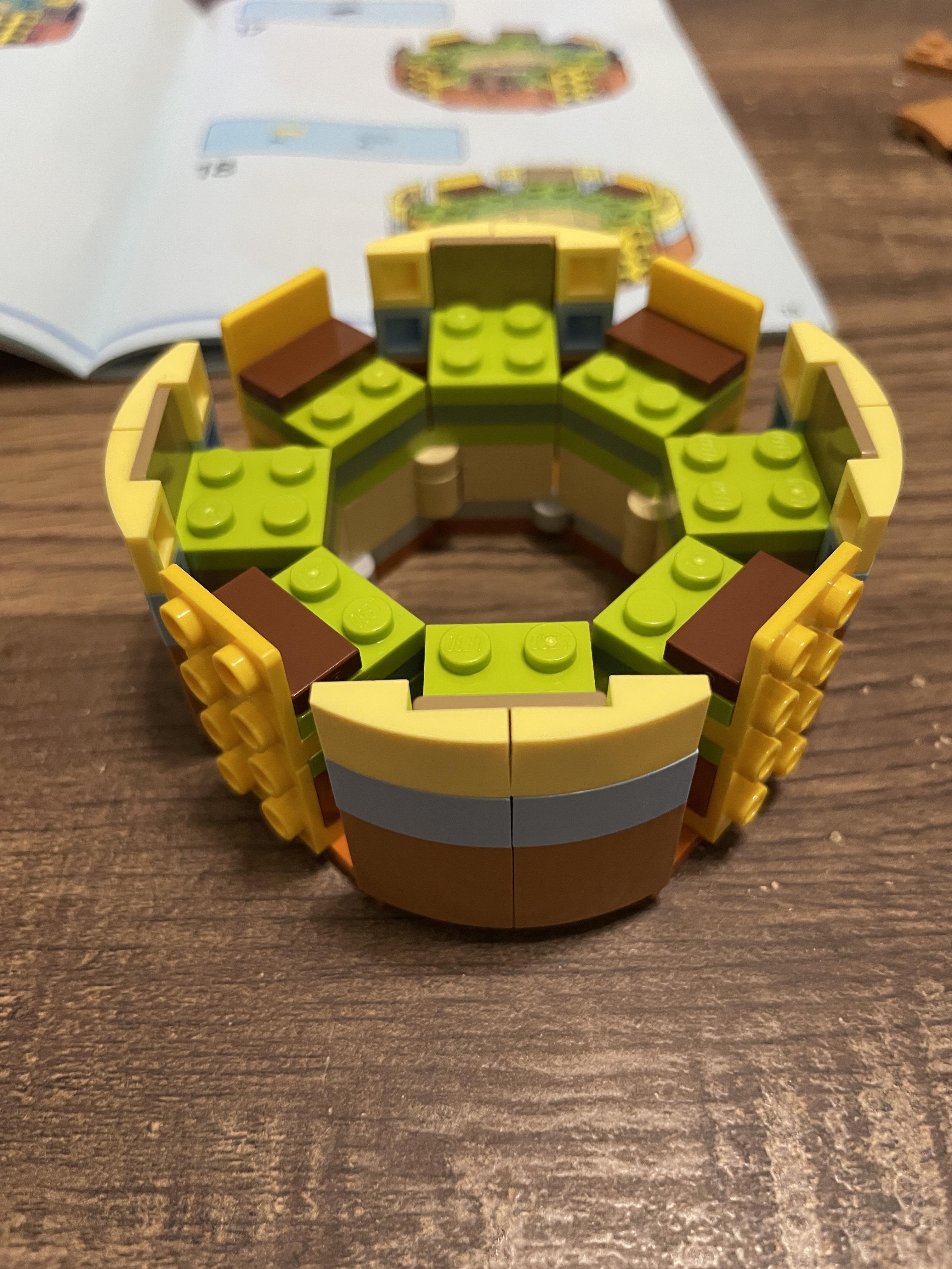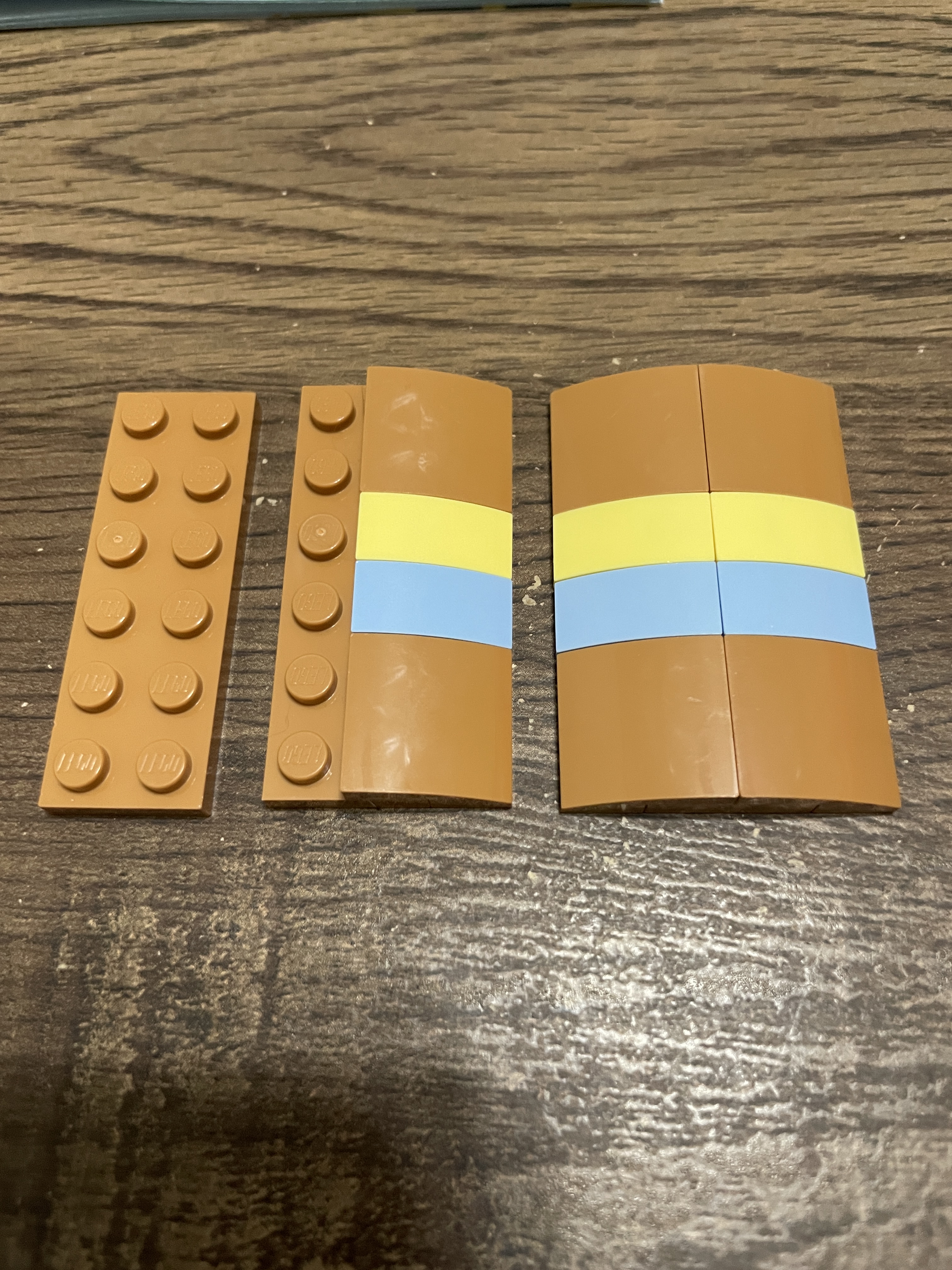 On top of the brick layer, 2×2 bright green plates and a 1×2 sand green plate are added to each section. Onto the studs not on top (SNOT) plates, 2×2 light brown slopes cover the studs, creating a rounded exterior.
