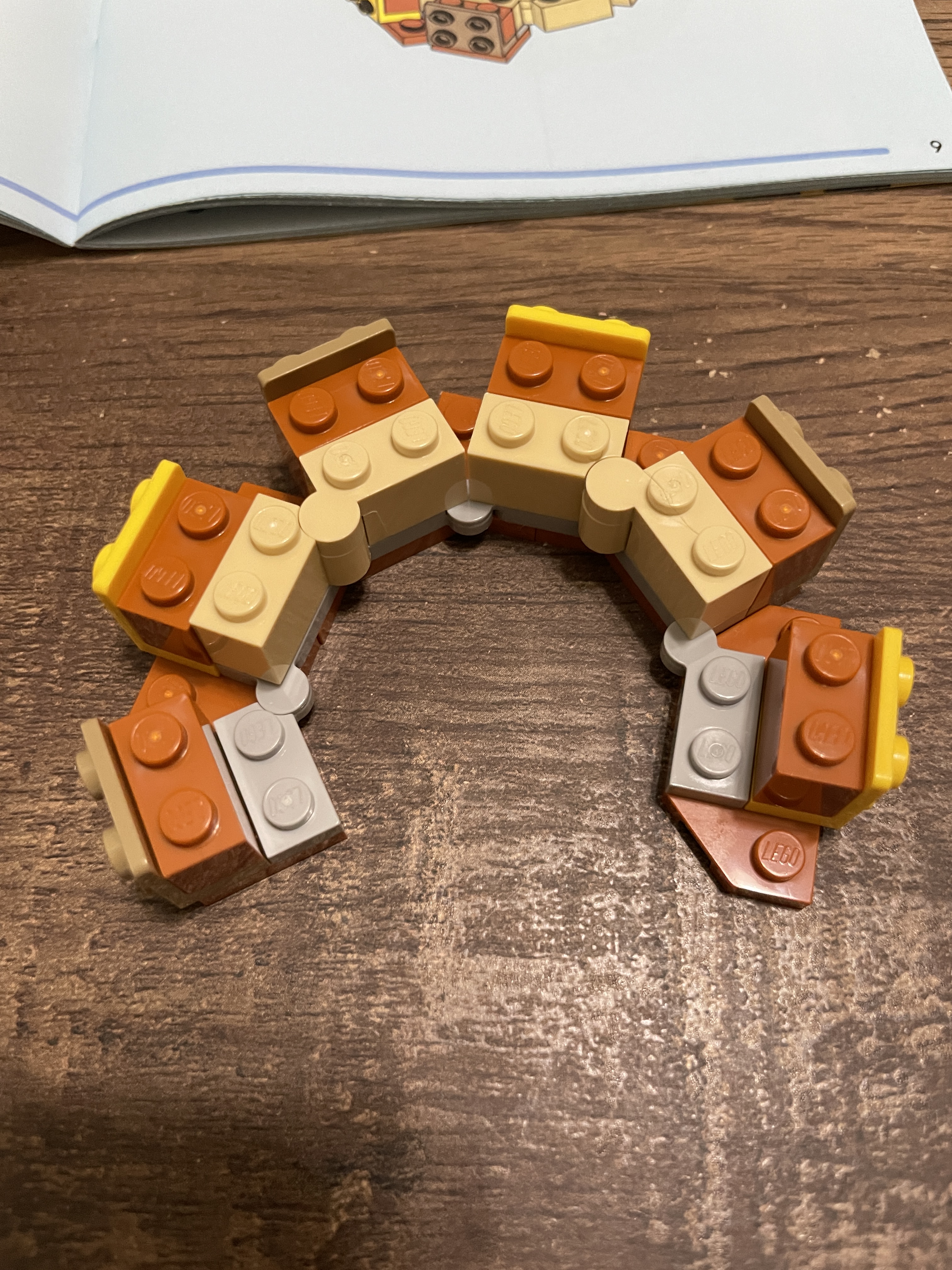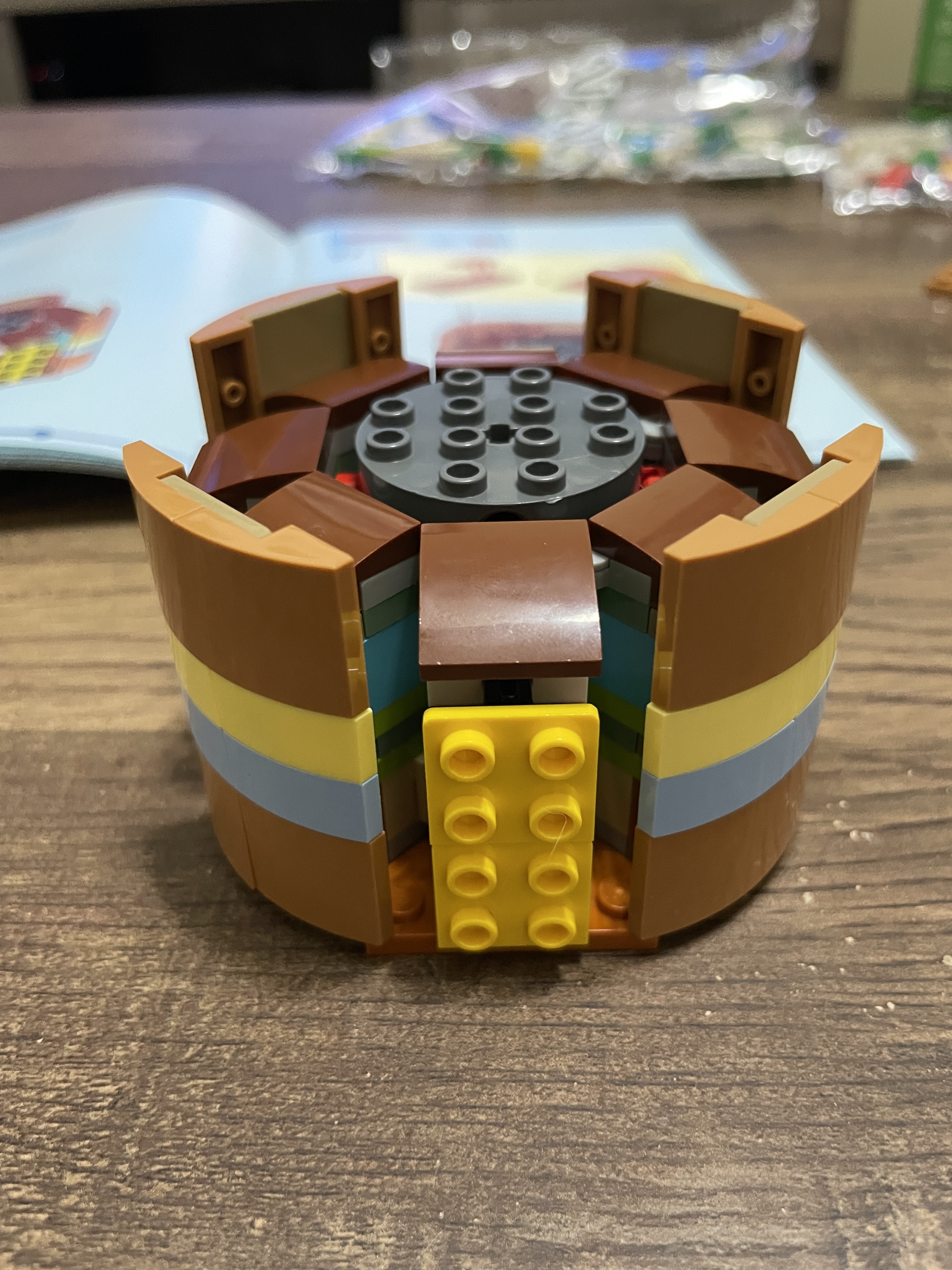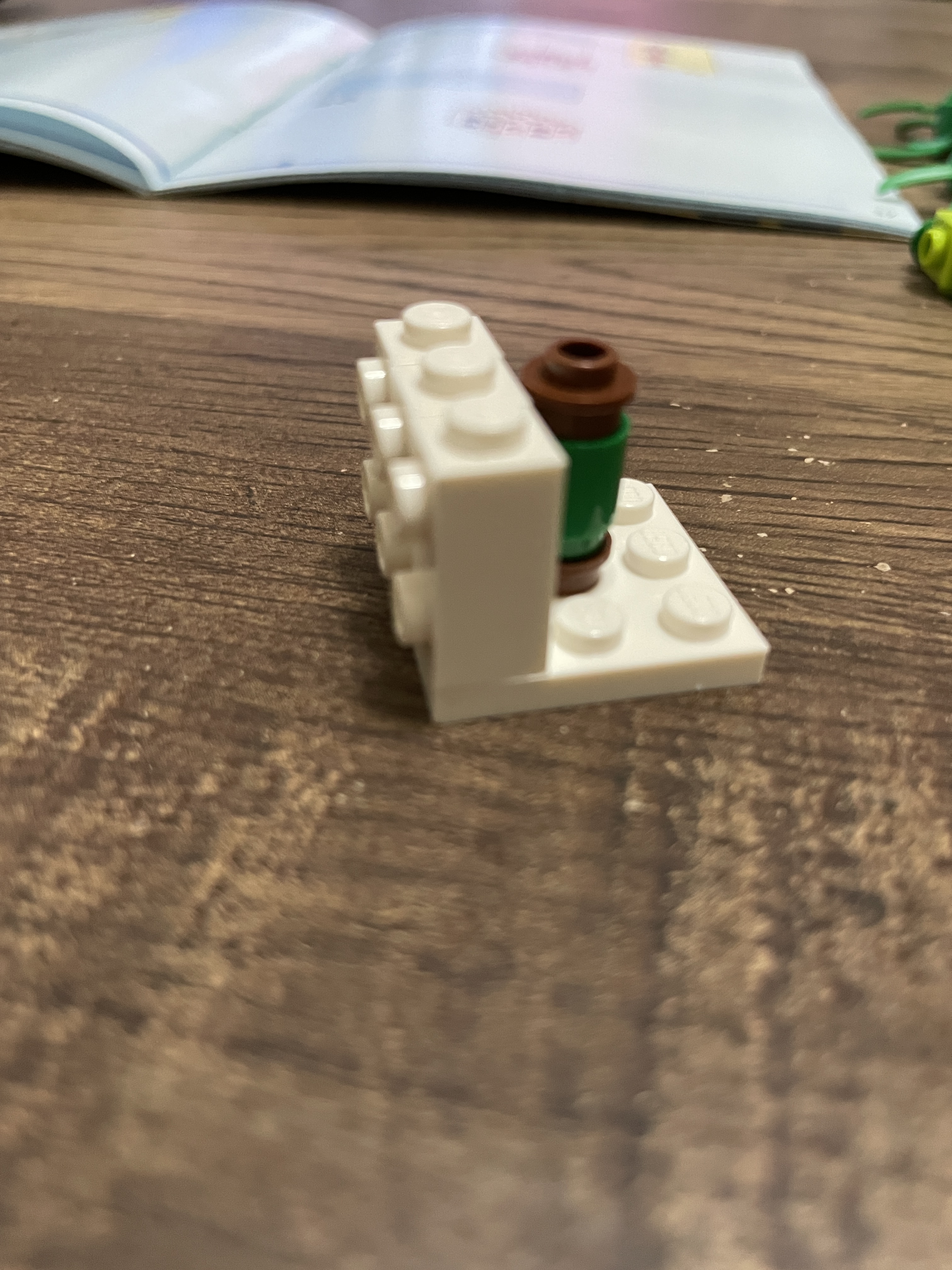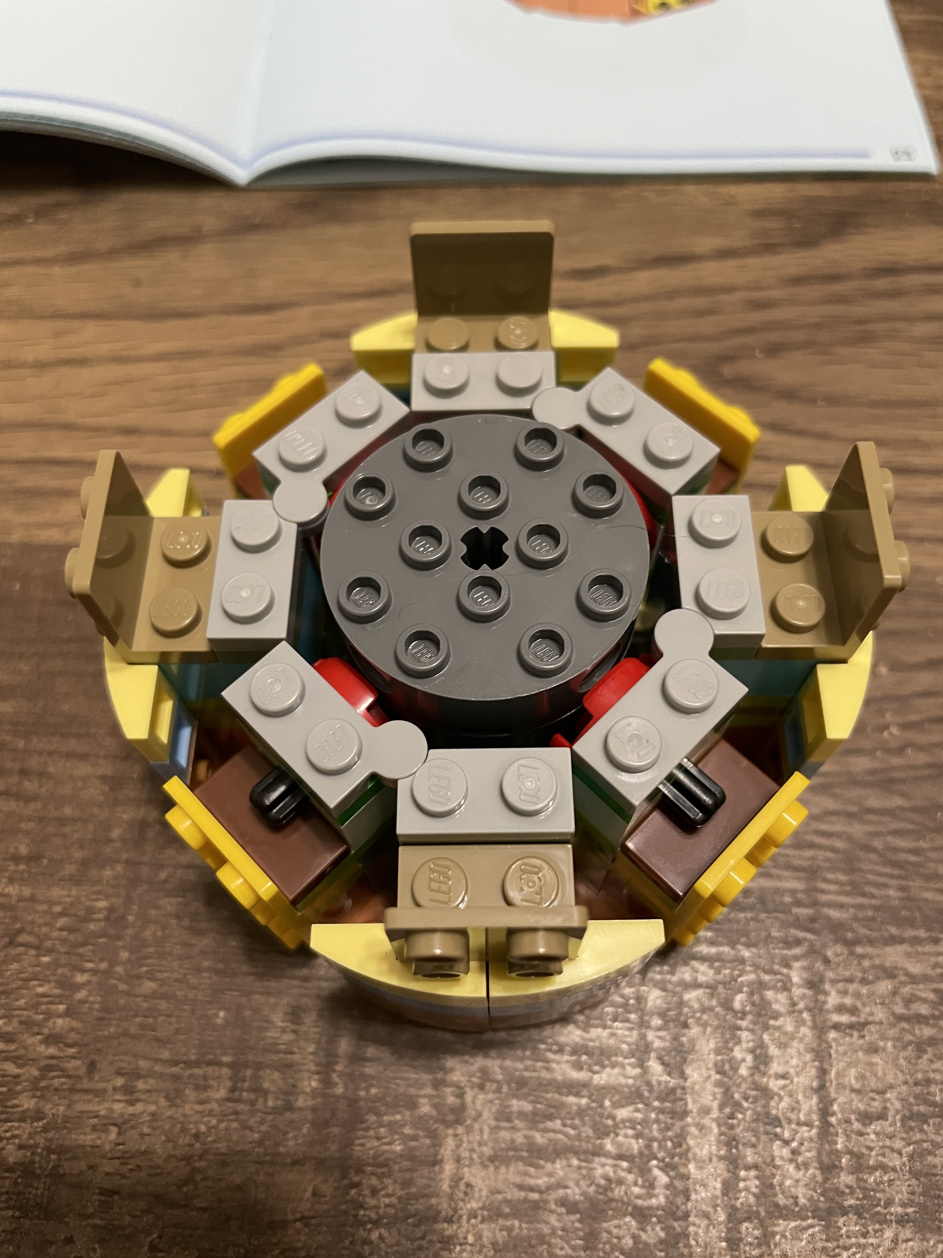On top of the brick layer, 2×2 bright green plates and a 1×2 sand green plate are added to each section. Onto the studs not on top (SNOT) plates, 2×2 light brown slopes cover the studs, creating a rounded exterior.