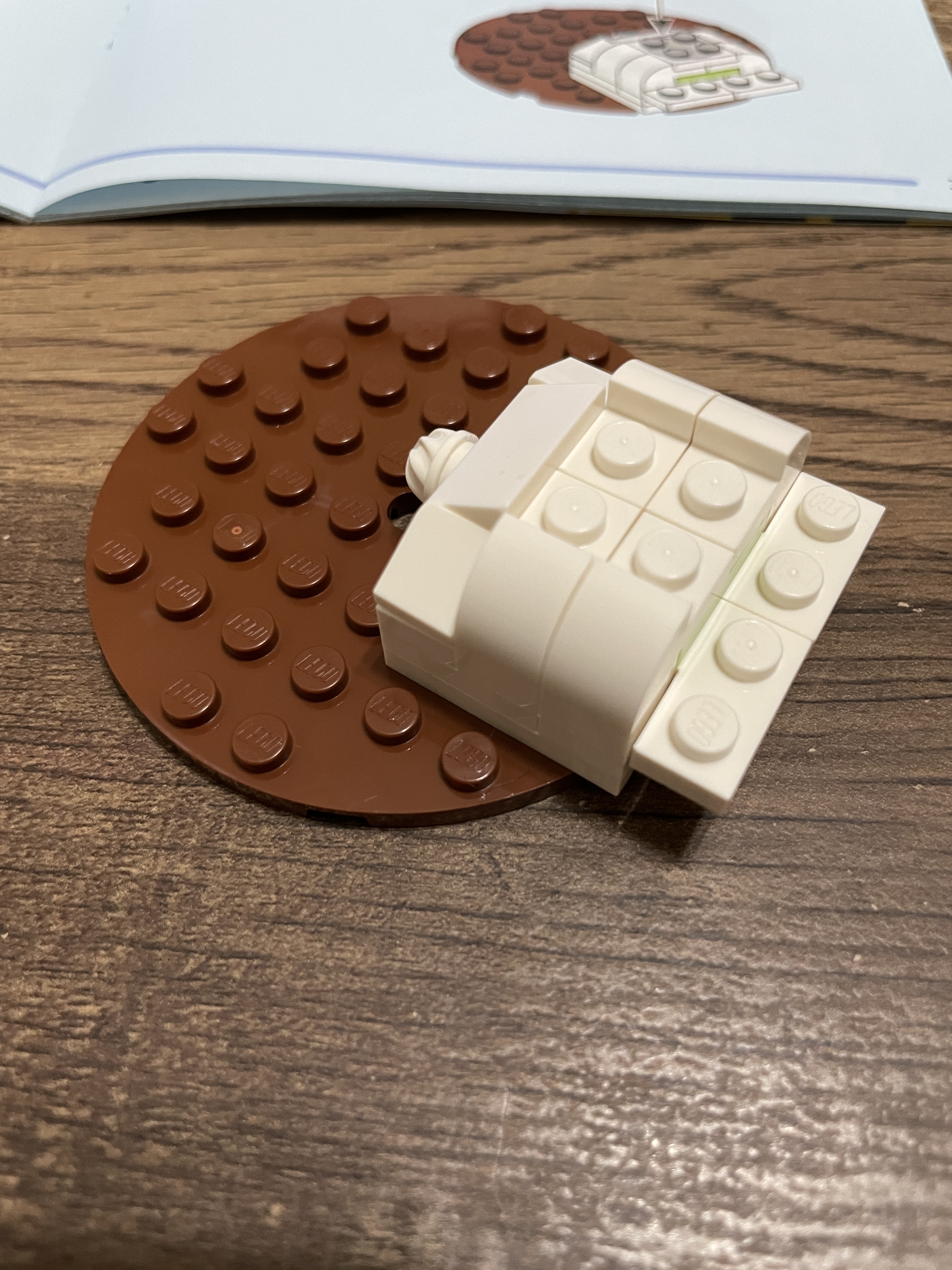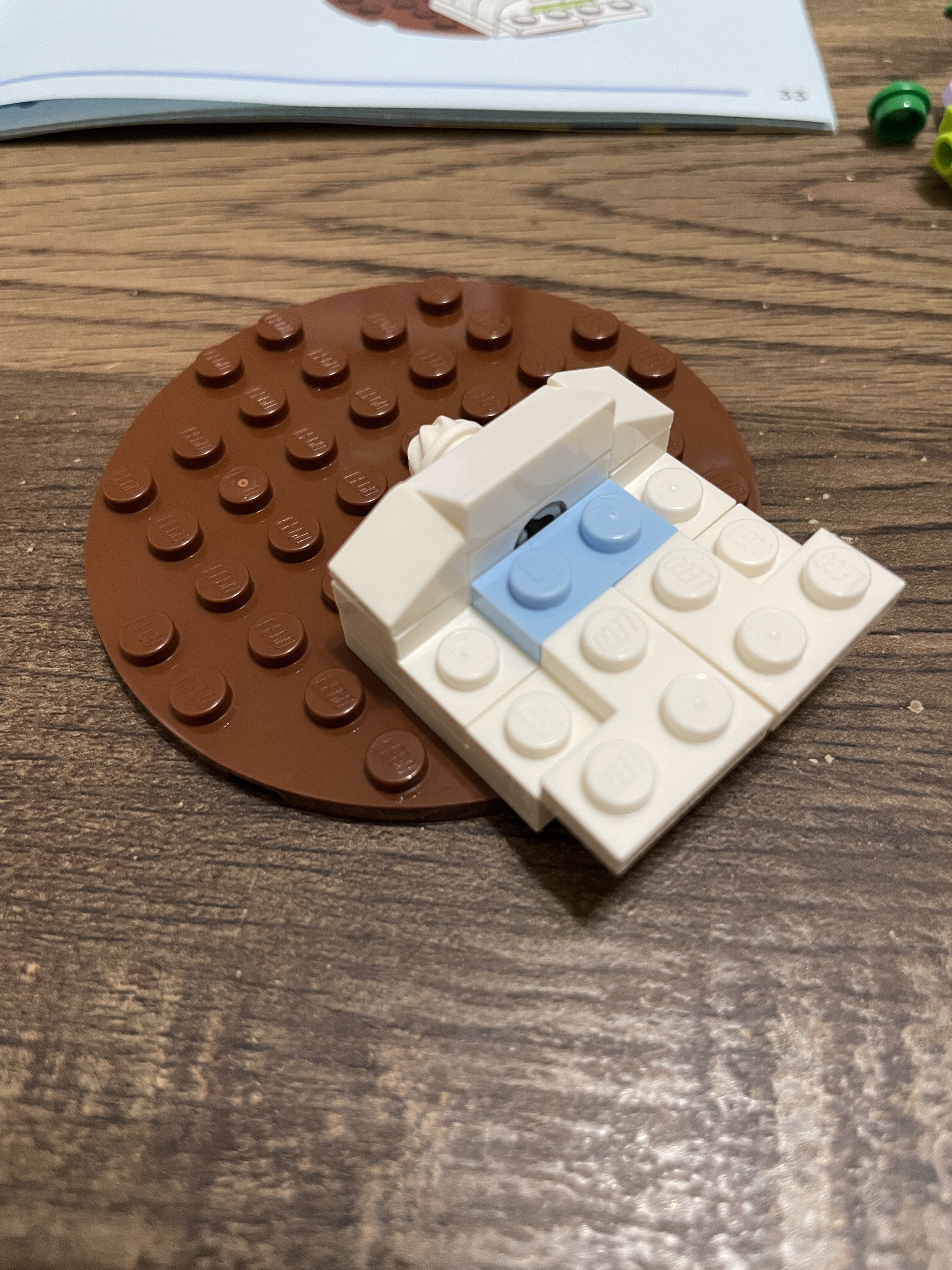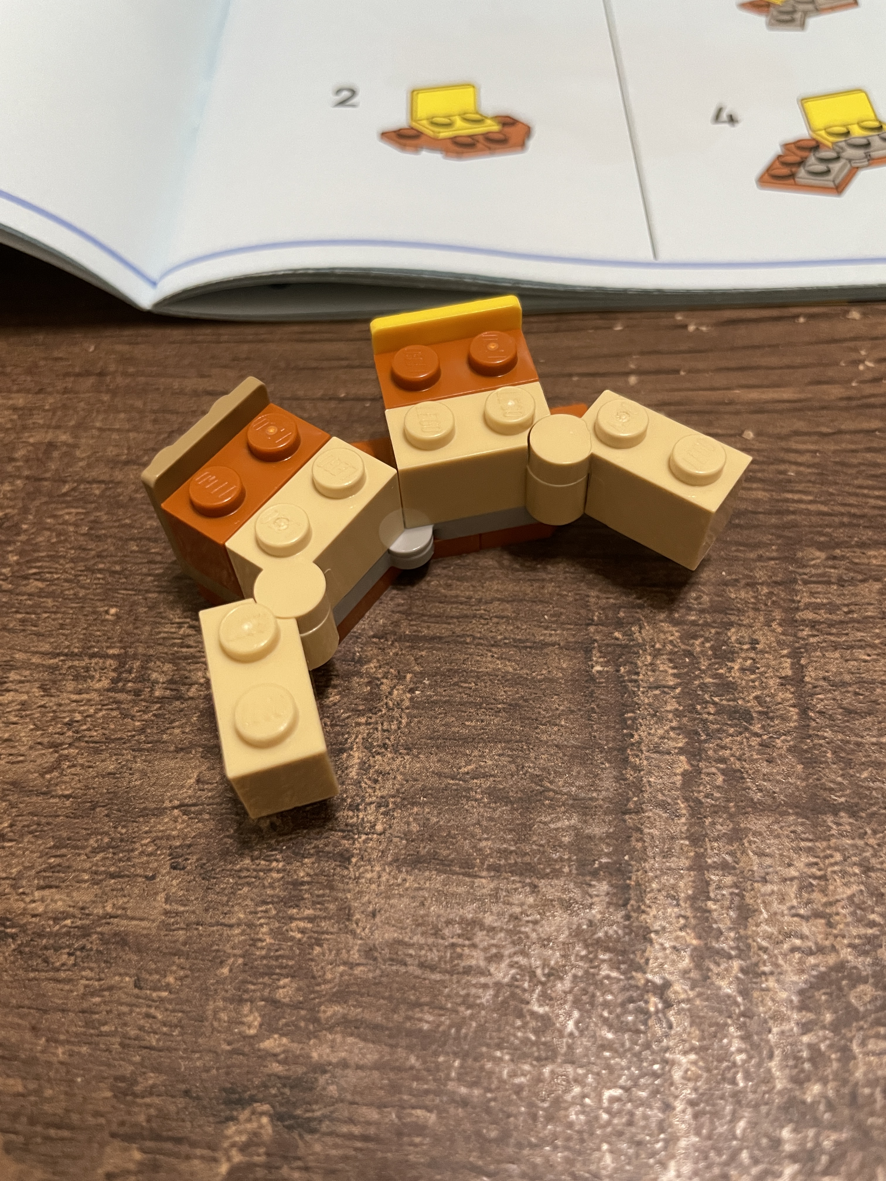 On an 8×8 reddish-brown circular plate, two 2×3 white plates are placed as the rabbit’s foundation. Stacked on top are more white plates, a modified 1×2 white brick with a hole, and a 1×2 wedge. A technic pin is placed into the hole, and a decorative white stud is connected. This is the bunny’s adorable bobtail, and I am in awe of this part’s usage. Yes, it’s simple, but I associate that element with either ice cream or building decorations – not as a little tail.