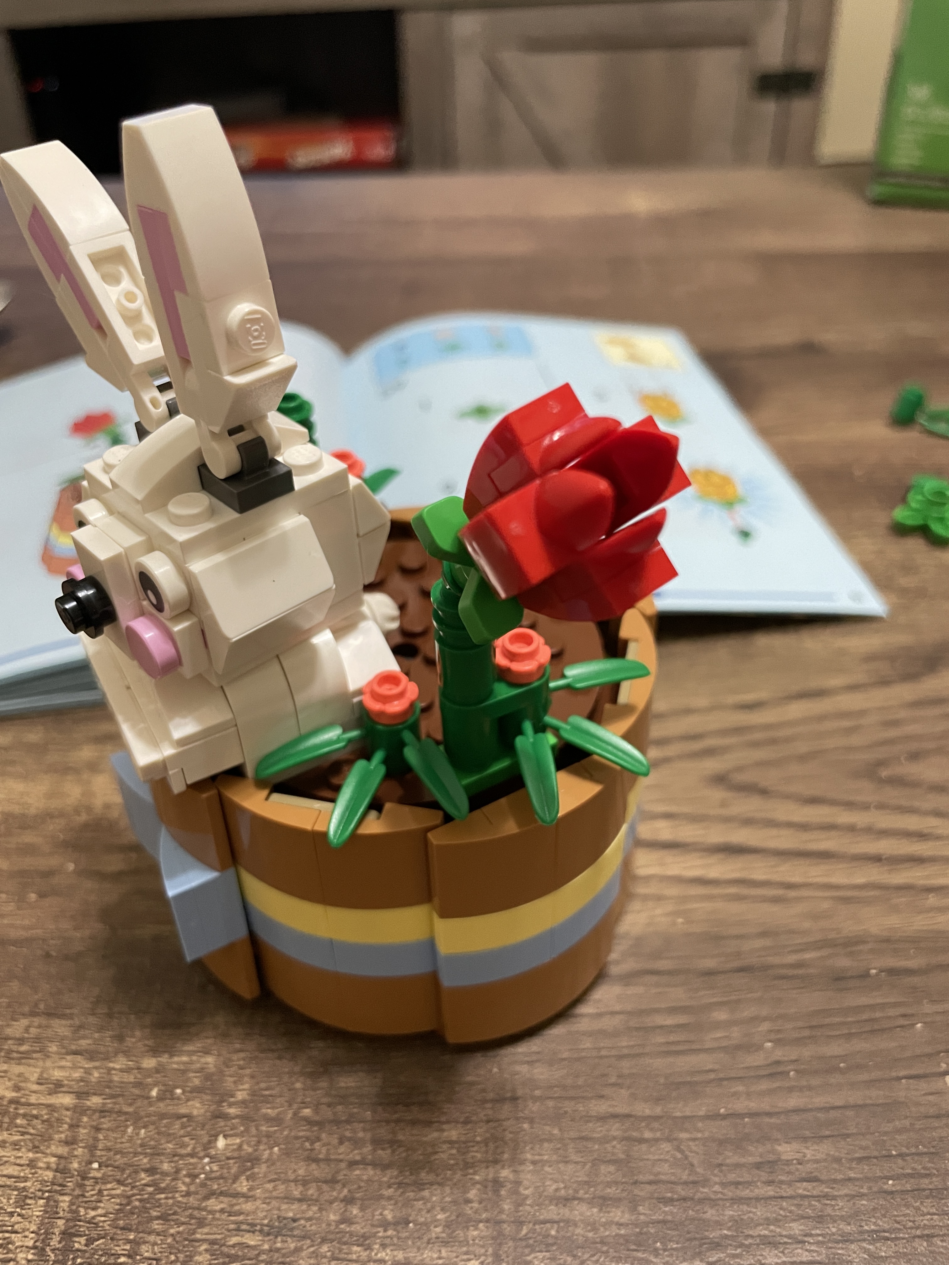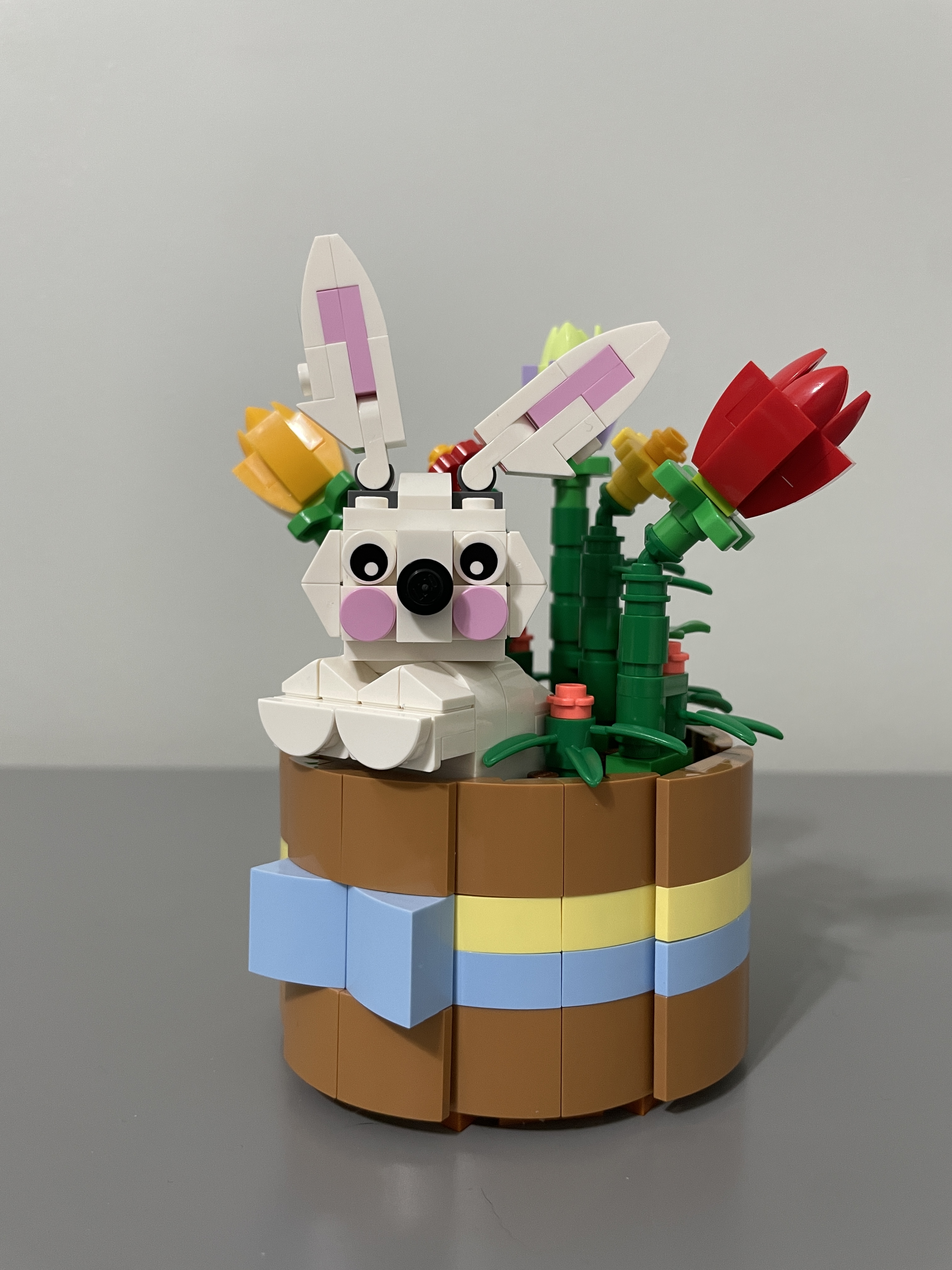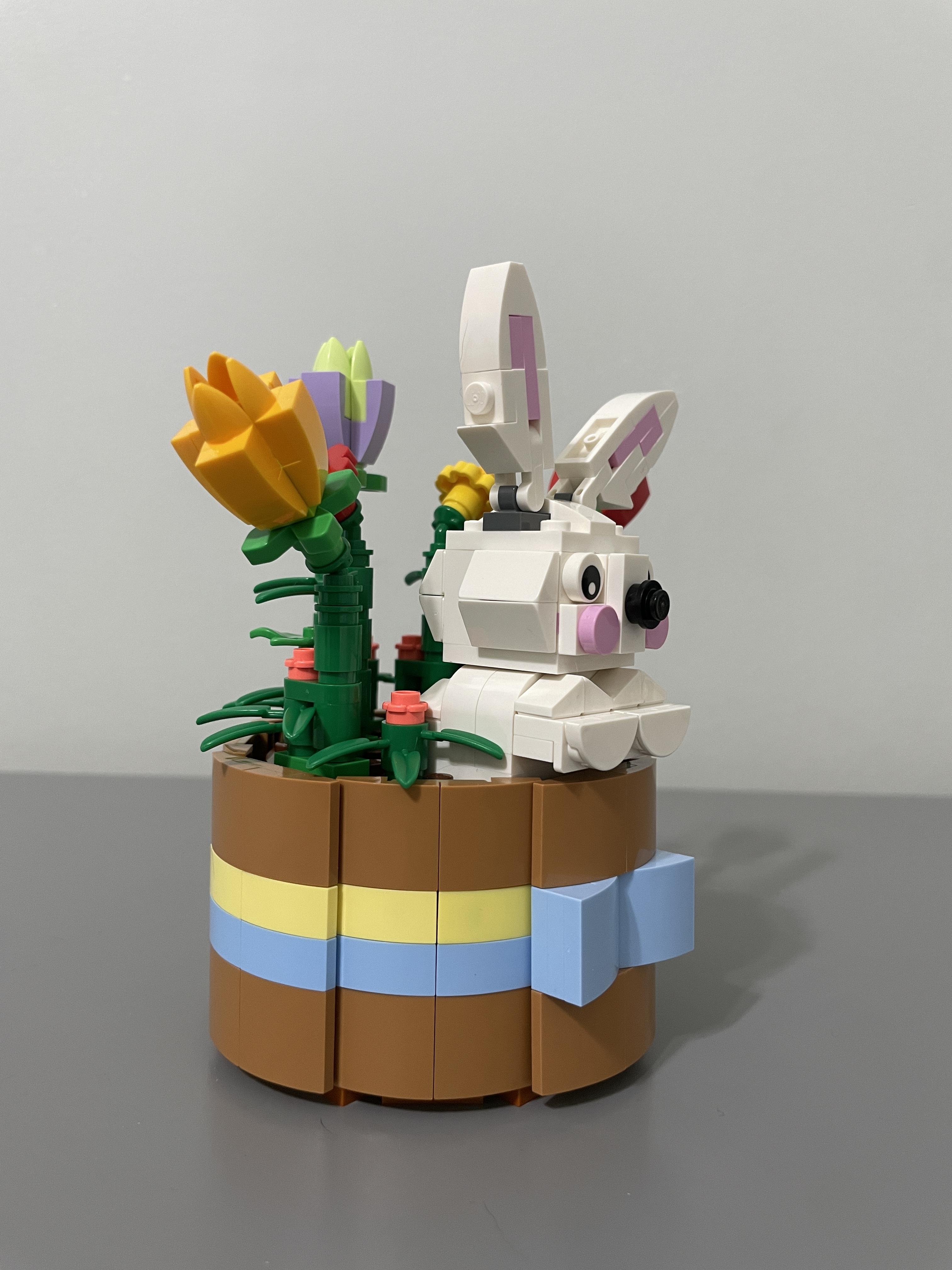 The build is complete, and the bunny looks like a cheeky fellow popping out of the flower pot.
