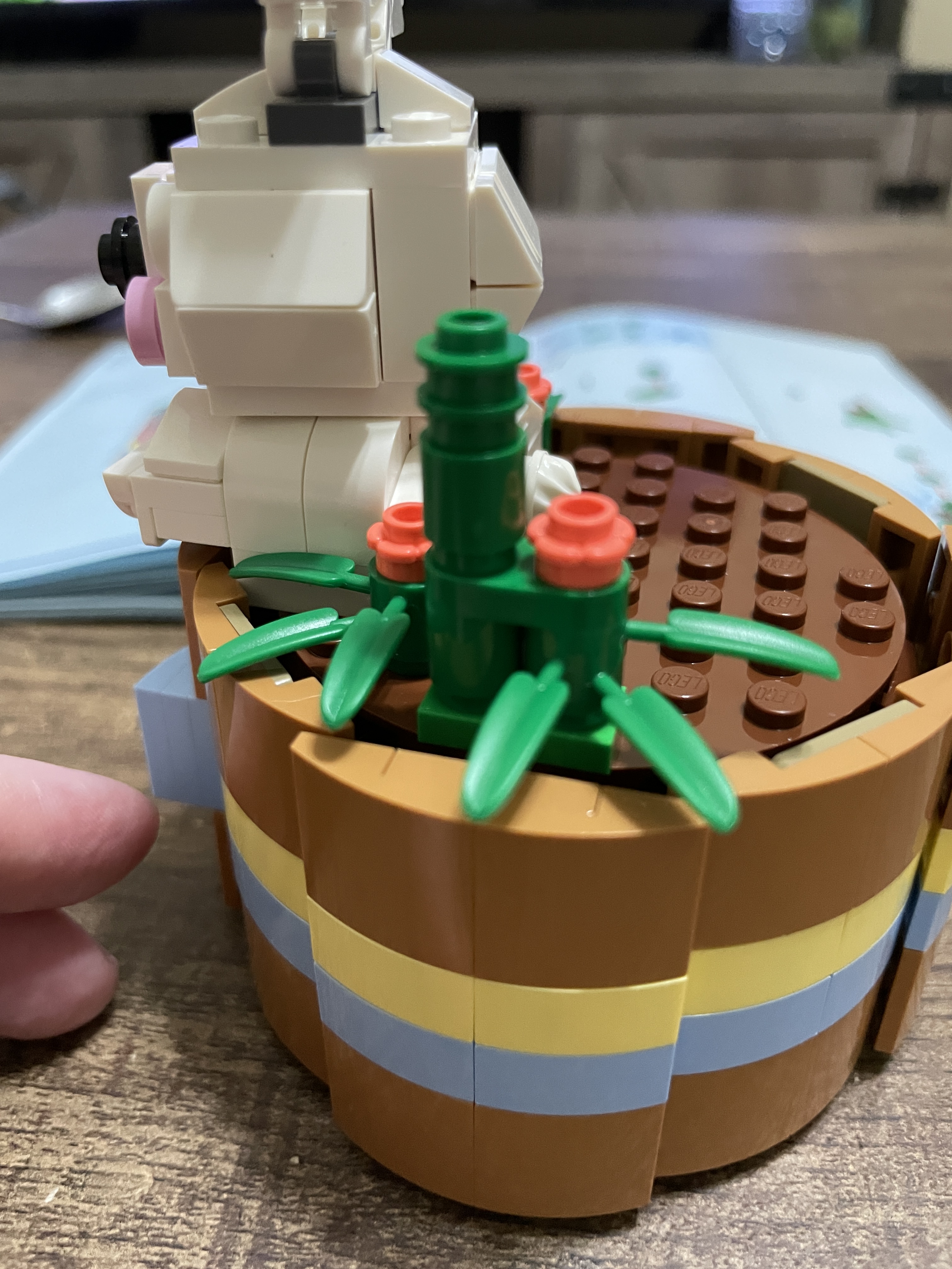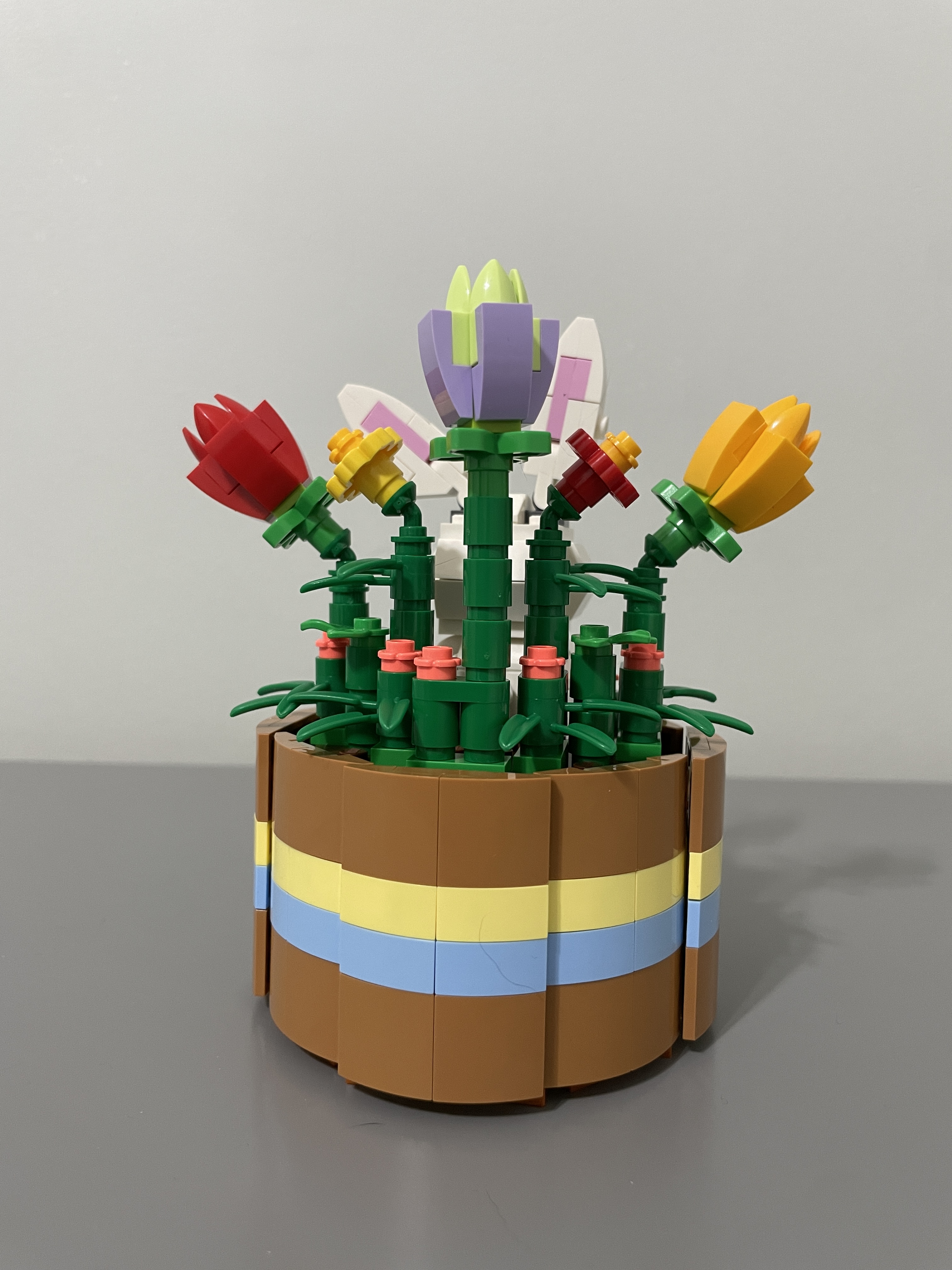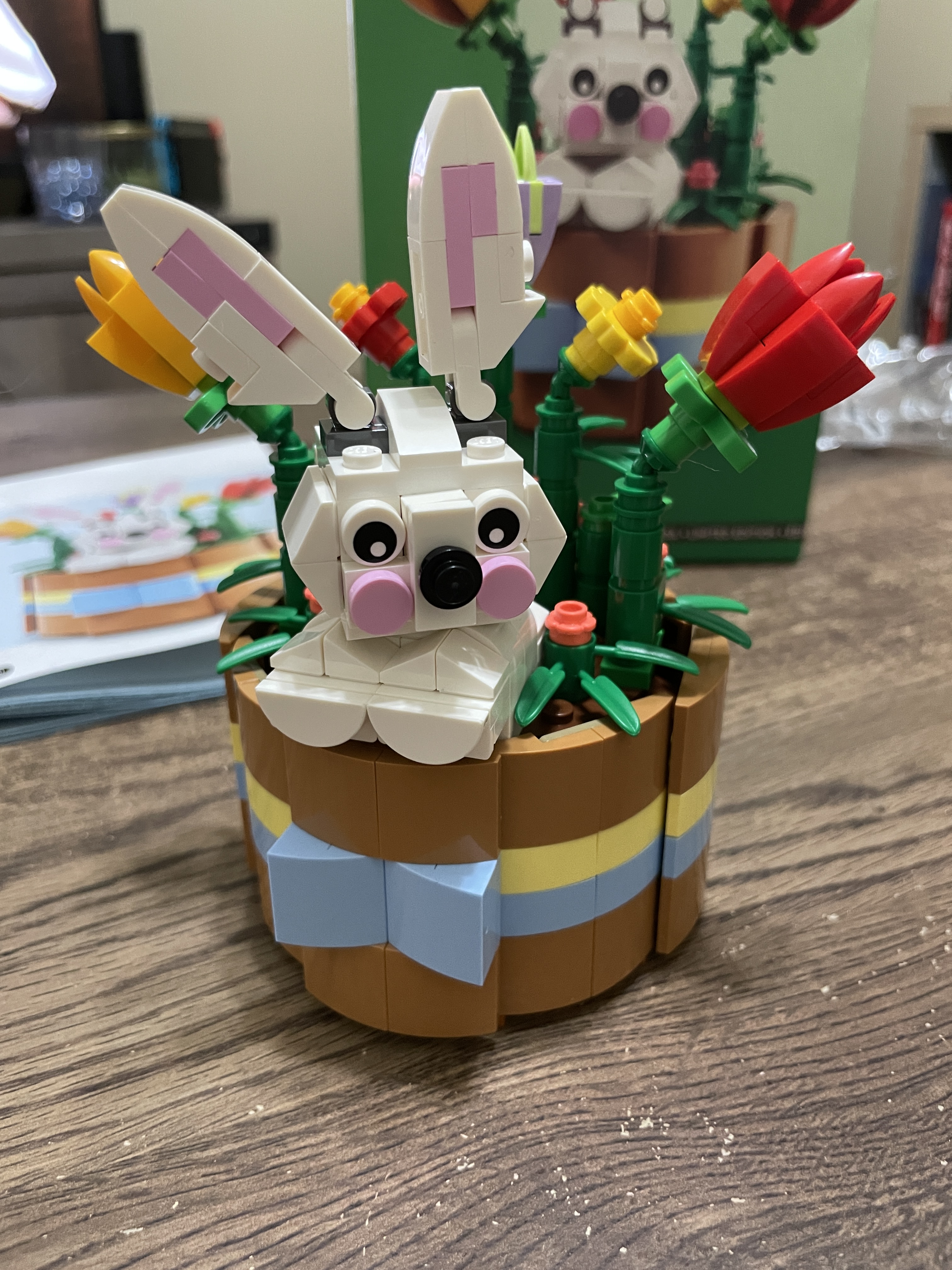 The build is complete, and the bunny looks like a cheeky fellow popping out of the flower pot.