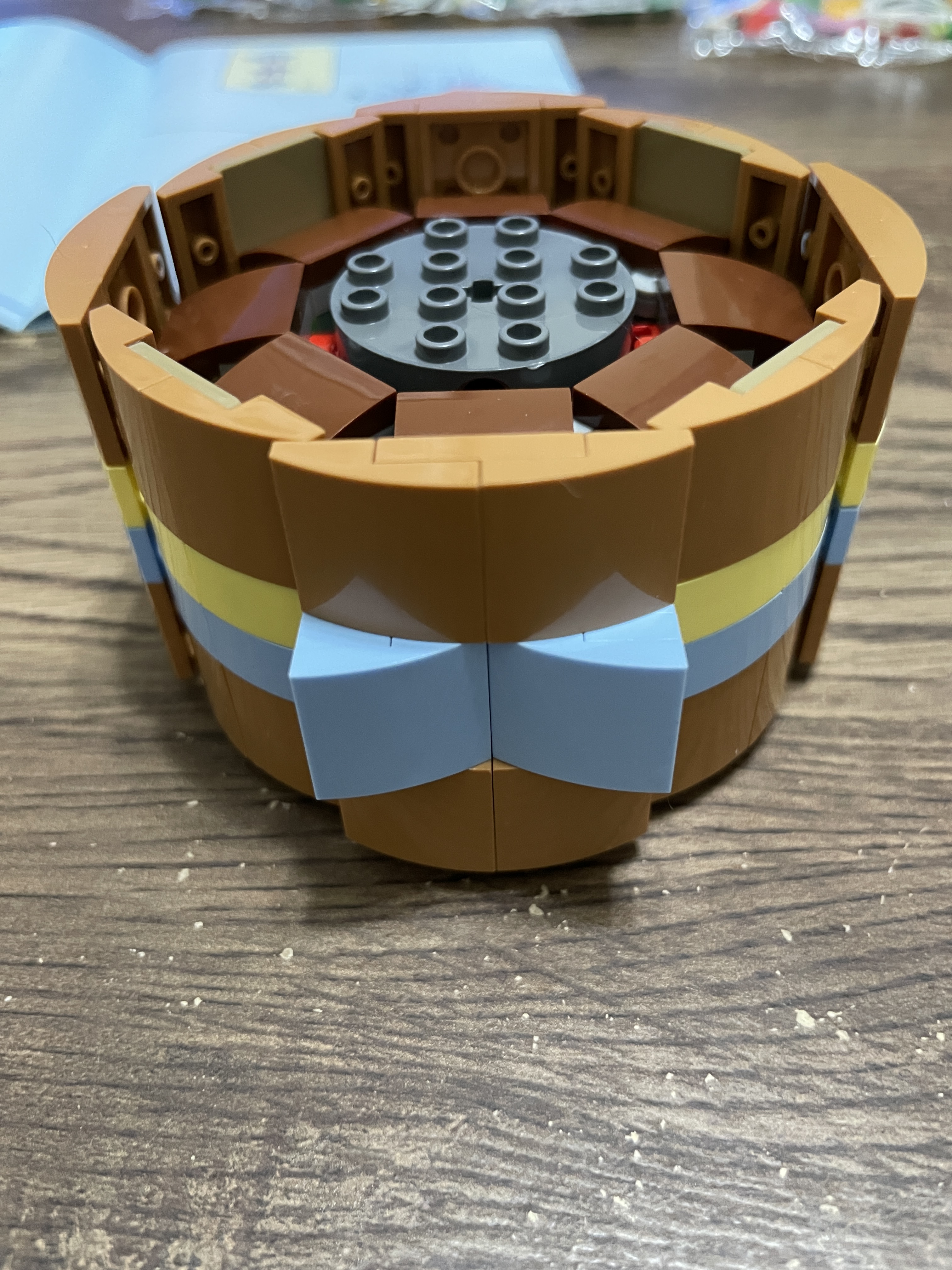 Covering the internal brickwork are eight 2×2 reddish-brown slopes. A final layer of 2×2 brown slopes covers the SNOT plates above the ribbon. The final SNOT plate is covered with a slightly different design, so our ribbon has a bow. To create height, the 2×2 light blue slopes sit on two stacked 1×2 plates.