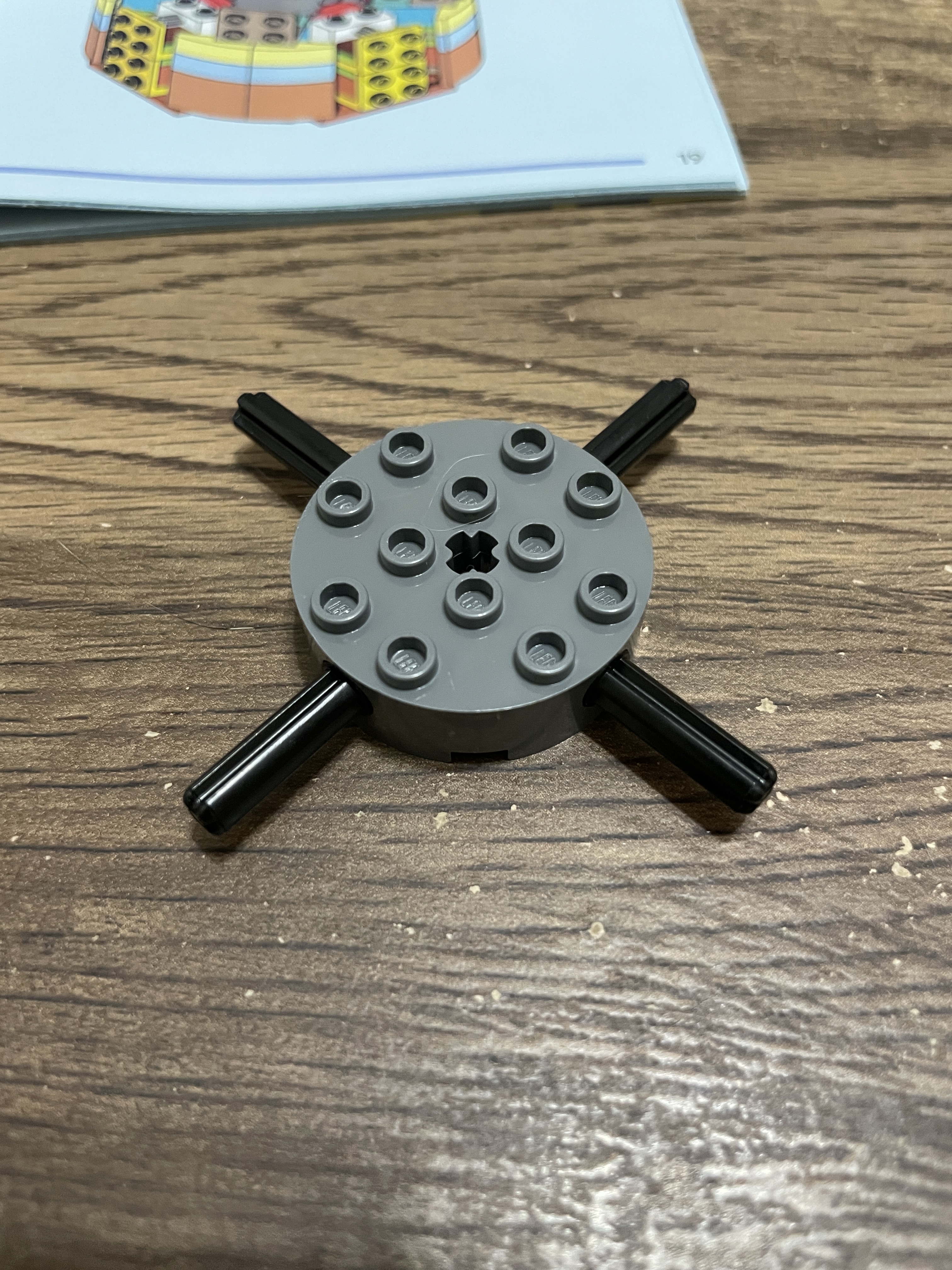 Now that the core of the flower pot is complete, a technic element “fills in” the pot. A 4×4 circular part has four axles inserted at 90 degrees. Another circular brick is stacked, and red tiles with center holes slide onto the axles. To hold the red tiles in place, white 1×2 crossed technic bricks are positioned behind them. This structure then sits in the pot, with the edges of the axles resting on the reddish-brown tile.