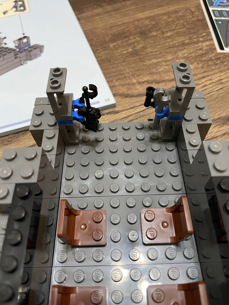 The fuselage starts to rise with a layer of mostly 1x dark grey bricks. Corner wedge bricks and inverted slopes soften some edges. Six brown chairs are added inside the cargo bay to hold our heroes. It looks empty and dull, but I don’t know what else I want to see there. A tool bench or another computer console station? At the rear, we have a mini tool bay with handcuffs, a radio, a spanner, and binoculars. It’s well designed for the Avengers to grab something they need before jumping out of the bay door.
