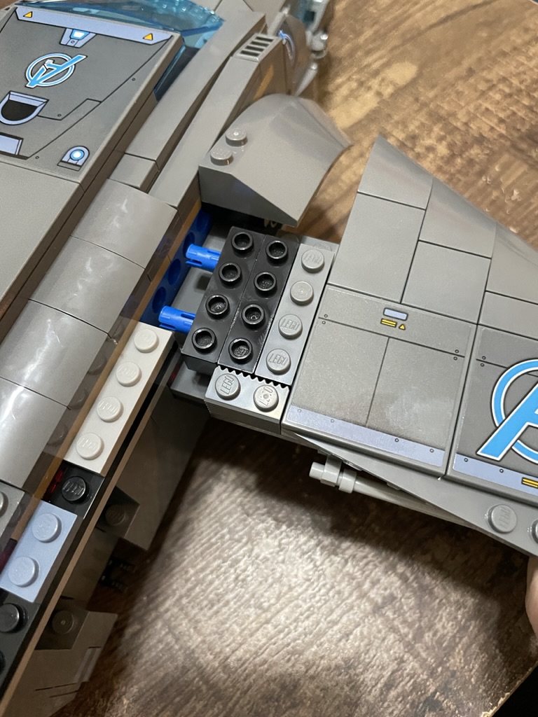 The entire structure is placed on top of the Quinjet, just behind the wings, by clipping into the connections. This method of affixing allows the engines to sit at different positions if you don’t want them flush with the fuselage.