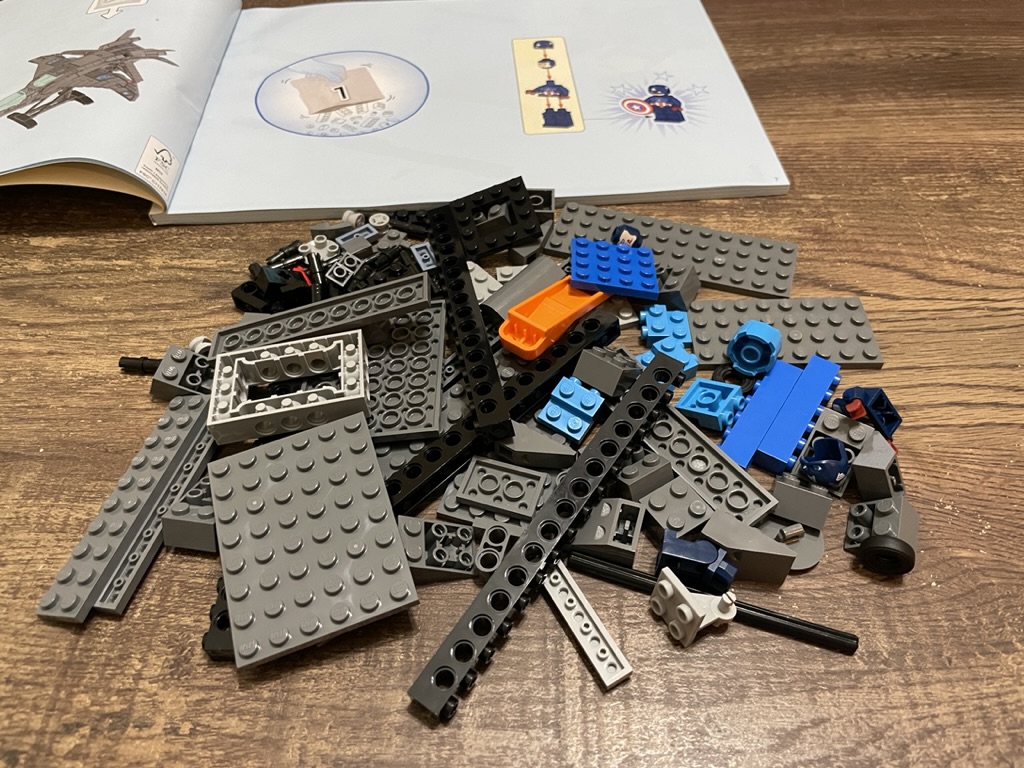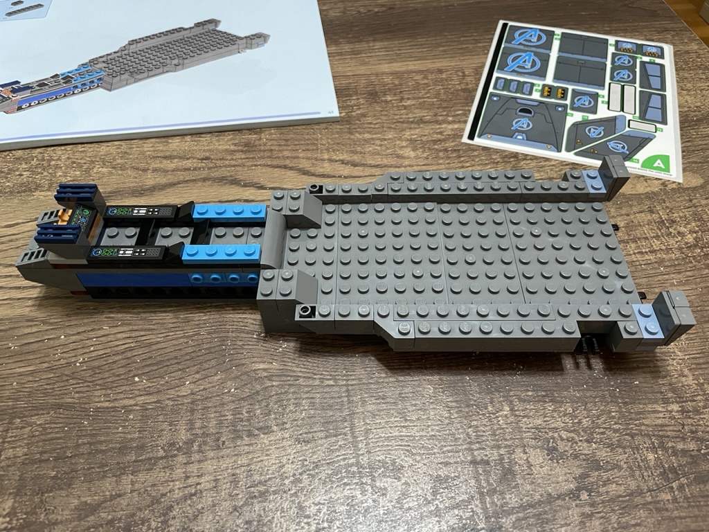 The Avengers Quinjet comes in typical Marvel packaging, showing that it is part of the Infinity saga at the top right of the box. The set is front and center, and the five minifigures are at the bottom. It’s 795 pieces with seven build stages, one instruction booklet, and two sticker sheets – one for SHIELD and one for Avengers motifs. Controversially, you must choose which sticker set you want to use, as the set does not provide additional pieces to switch the build between the two options. I went with the Avengers as I love them, and the blue on their stickers would look better than the grey of the SHIELD logo.