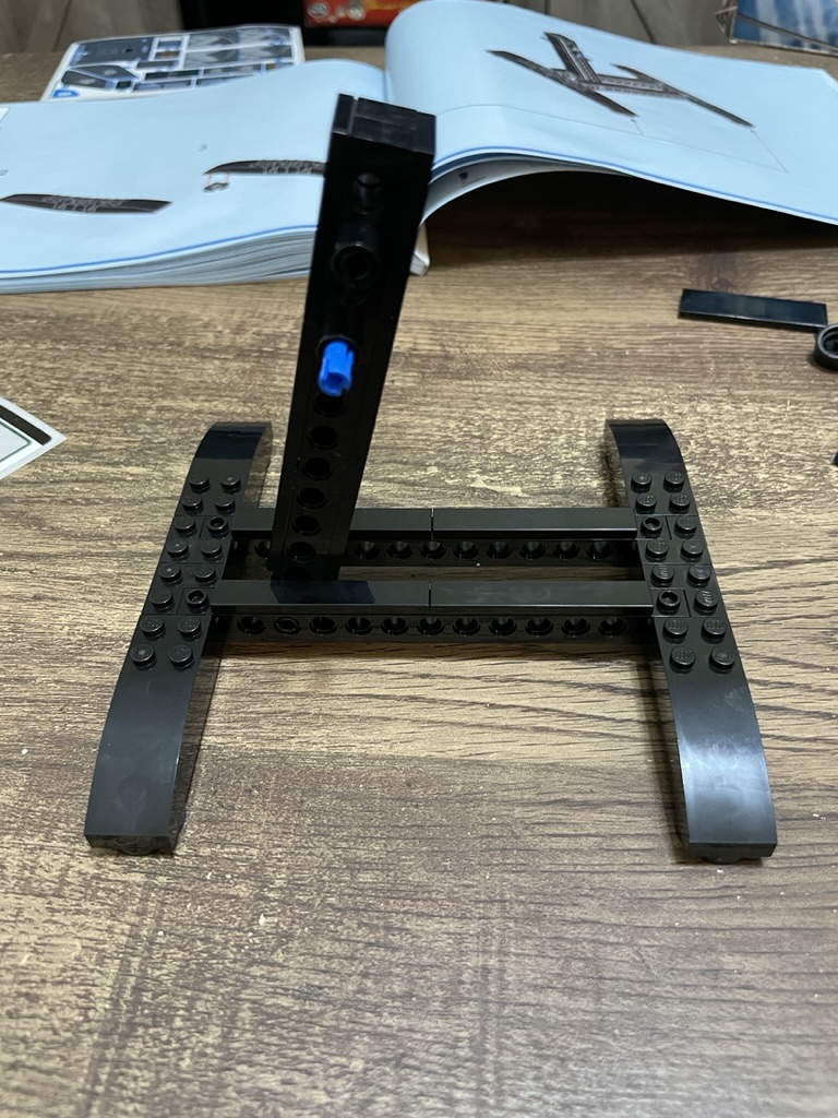 The black stand begins with technic bricks, connectors, and 2×4 tiles on top. Two additional technic bricks are covered in tiles, leaving an open stud at each end. These become the feet anchors, joining via the black connector. These are two mirror image builds consisting of slopes with exposed studs on top attaching to a long black plate. In the center, 2×2 corner bricks leave a gap for the feet anchors connection. Most of the exposed studs are then converted with 2×4 black tiles.