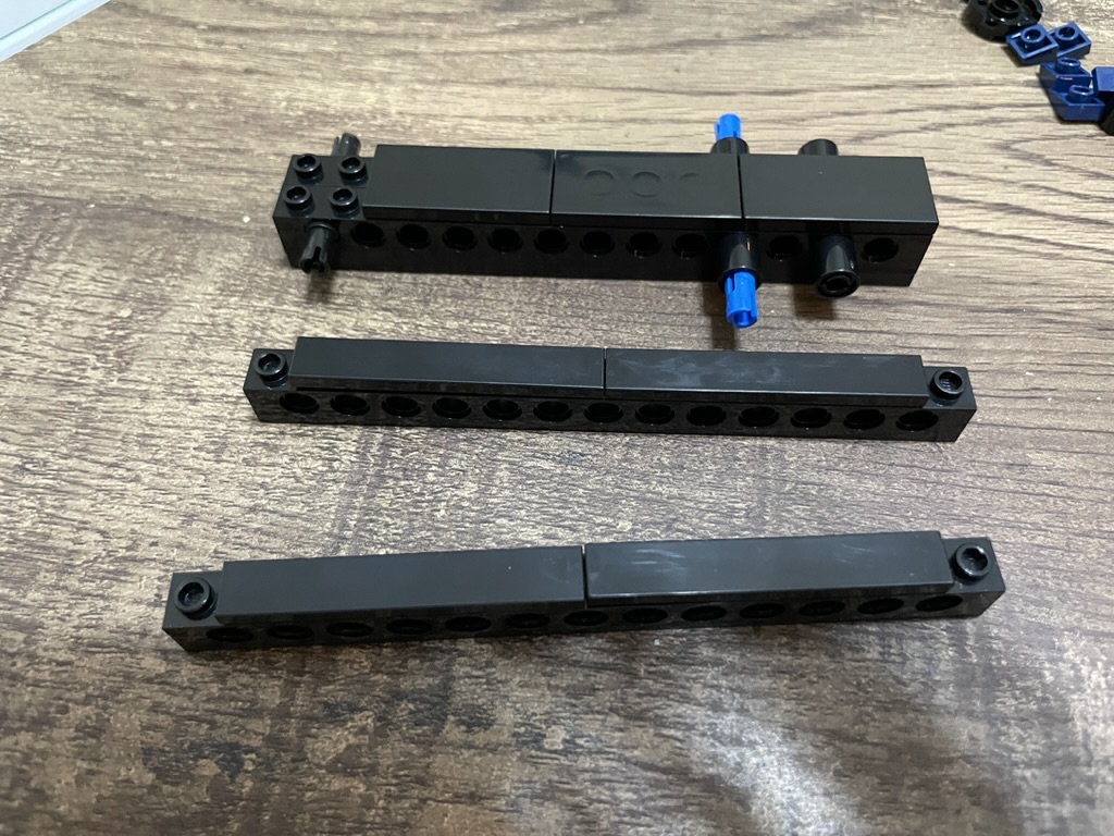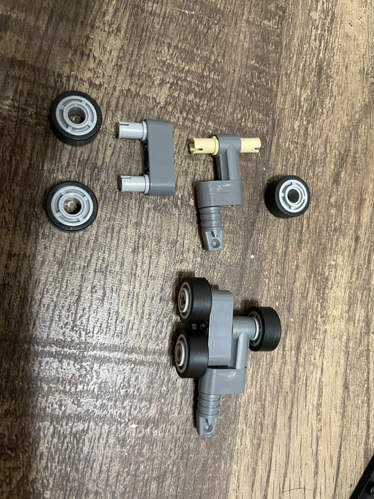 The landing gears are the same on both sides, and my picture shows the parts partially built and then the fully assembled version. The technic pins allow the wheels to articulate, essential for storage and use as landing gear. The landing gears are attached to the fuselage via the black connectors added near the beginning of the build.