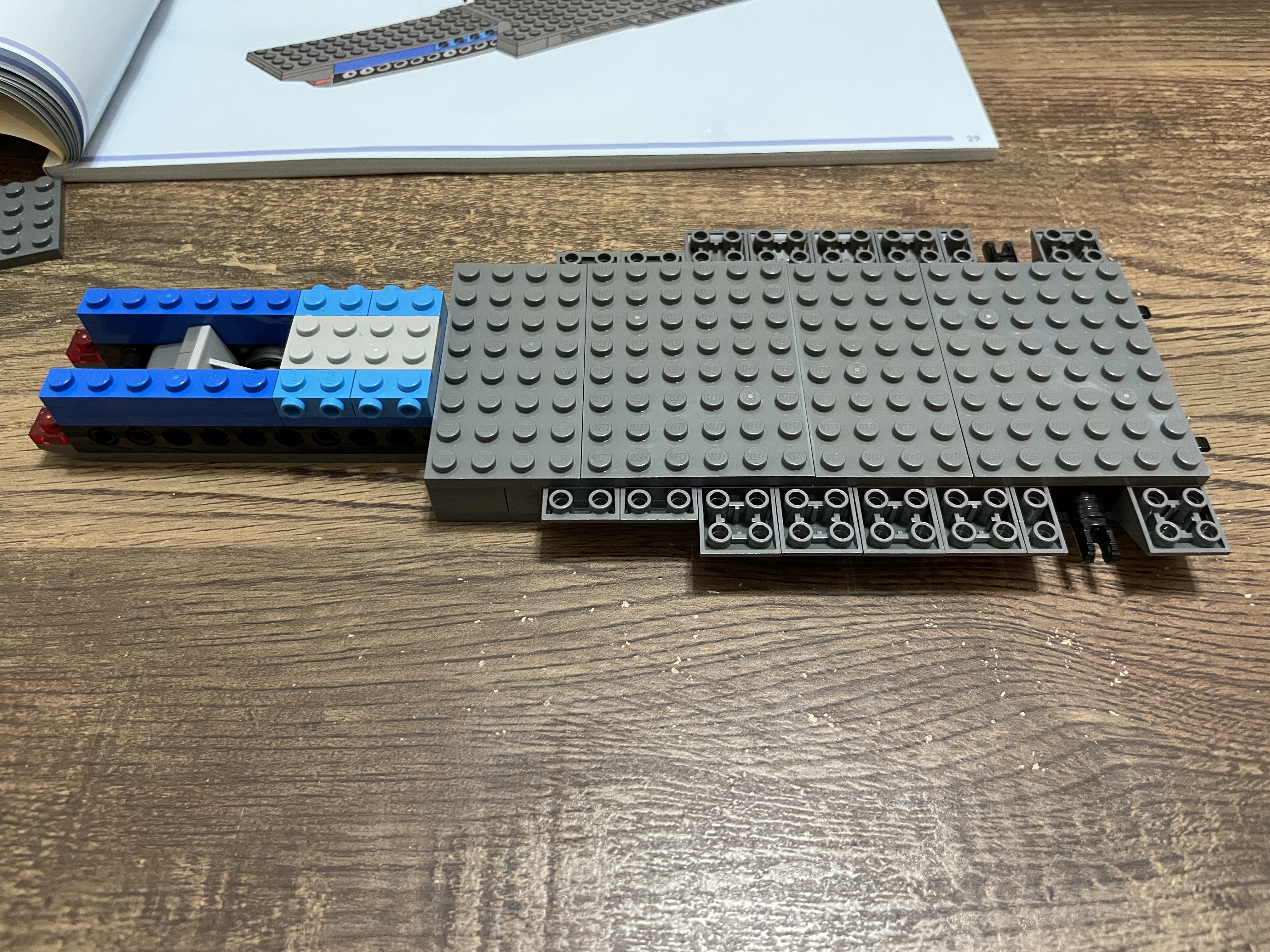 With the cockpit complete, additions to the fuselage are made to enable anchoring of the wings. First, blue technic 1×6 bricks on top of modified dark grey tiles create the start of the wing. Off the ship, black, light grey, and dark grey plate make the fuselage top, with some dark grey slope and tile elements added. At the rear, four 2×3 dark grey slopes and placed in front of a 2×8 light grey brick. Light blue, tan, and dark grey plates are layered, allowing dark grey curved slopes to connect along the edge, generating a smooth surface.