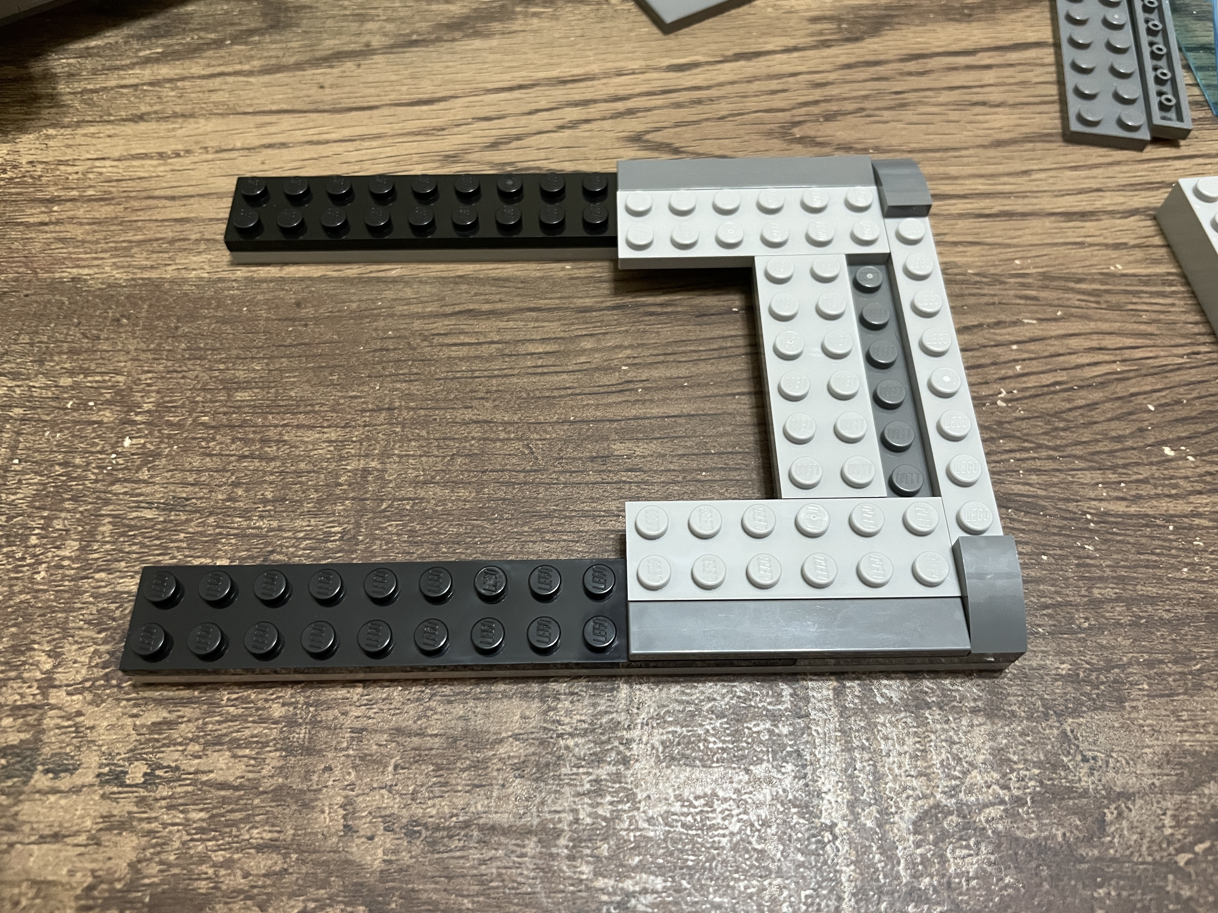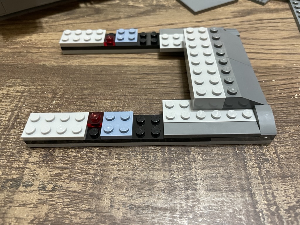 The canopy build begins with a 4×4 light grey plate connected to a 1×6 dark grey plate with 2×3 dark grey tiles. Another sticker element here enhances the design.