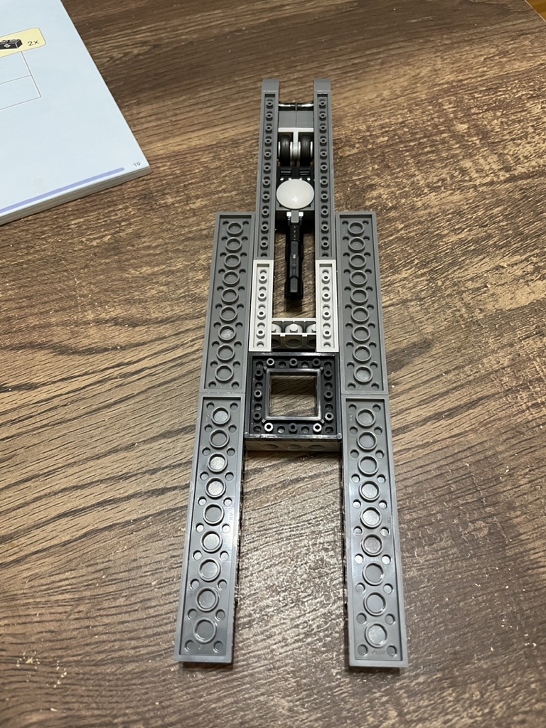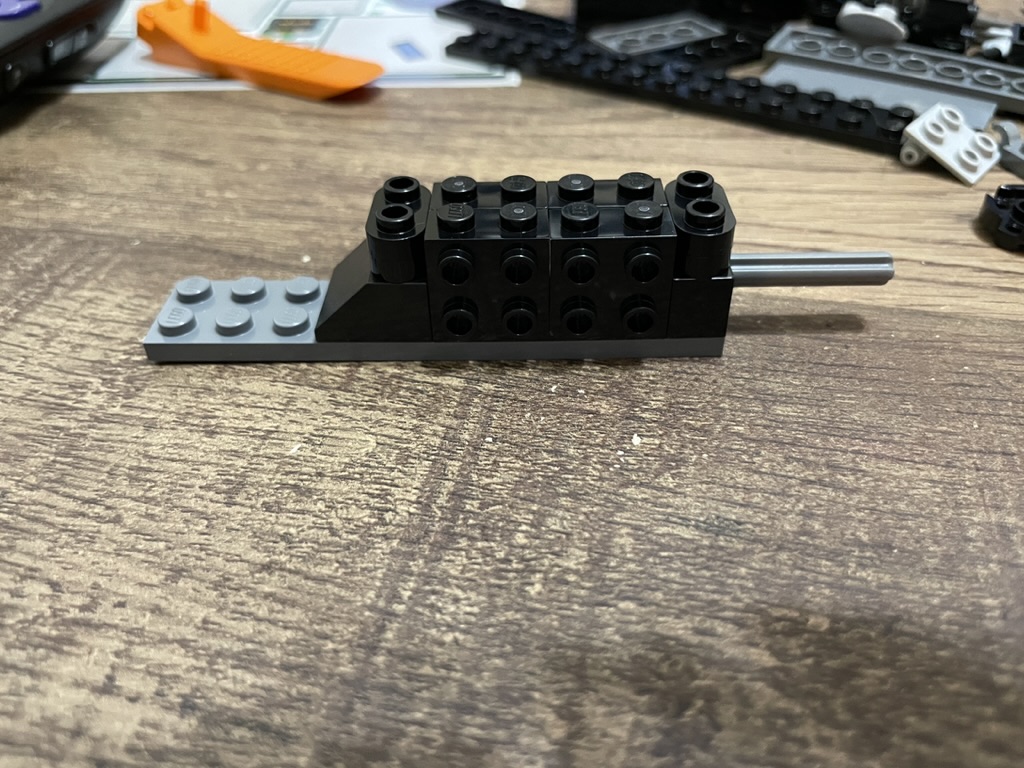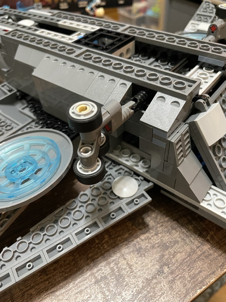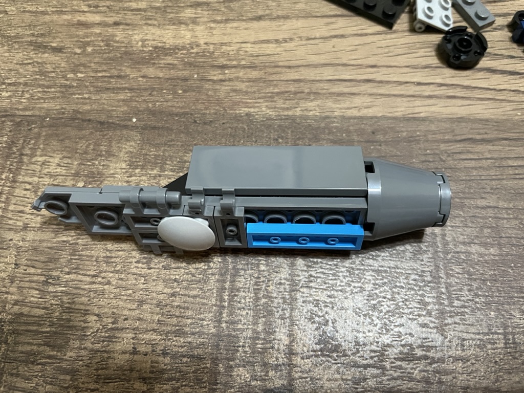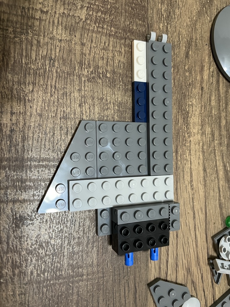 On the rod, a sizeable light-grey disc with a transparent blue wire disc connected – a practical part usage to look like the jet engines.