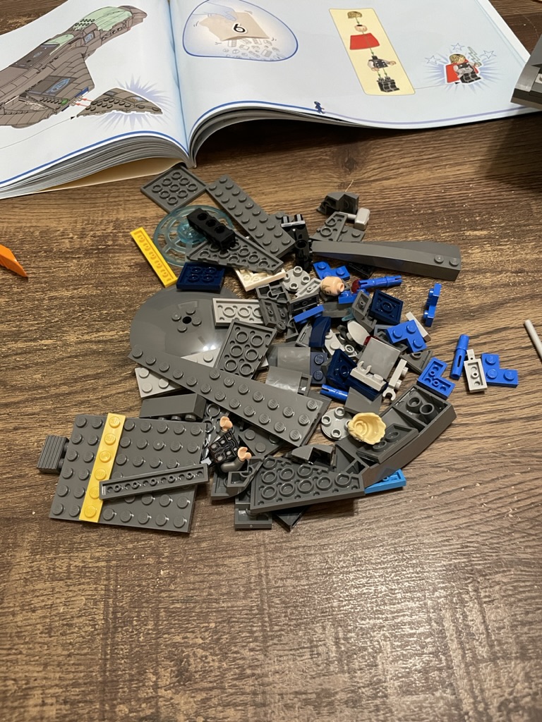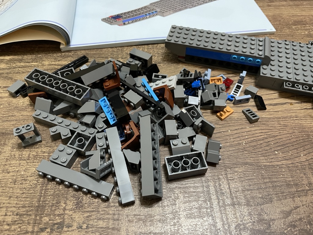 I am giddy at how fantastic this looks. The combination of blue and dark grey pieces is striking. The functionality of the roof is terrific too. Opening the back and popping the minifigures and their accessories in is easy. By the end of this stage, the entire fuselage is completed, and all that’s needed now are some wings so this jet can fly.