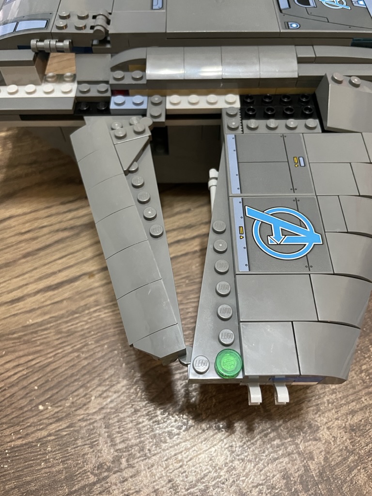 The sixth stage repeats the building process for the other wings, only the mirror image. One difference I spotted was the left side has a transparent red circular tile, and the right has a transparent green one. I would like to know if this relates to aviation practices to determine what wing you can see. Once both wings are in place, the Quinjet is almost complete!