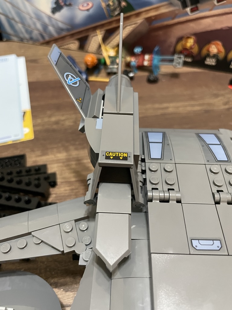 The front of the jet looks terrific with all these pieces added to give detail. I’m a fan of the design with the hinged elements to hug the sides and create a streamlined appearance. I’m glad I went for the Avengers motif, as the blue of the windshield makes the stickers’ color pop further.