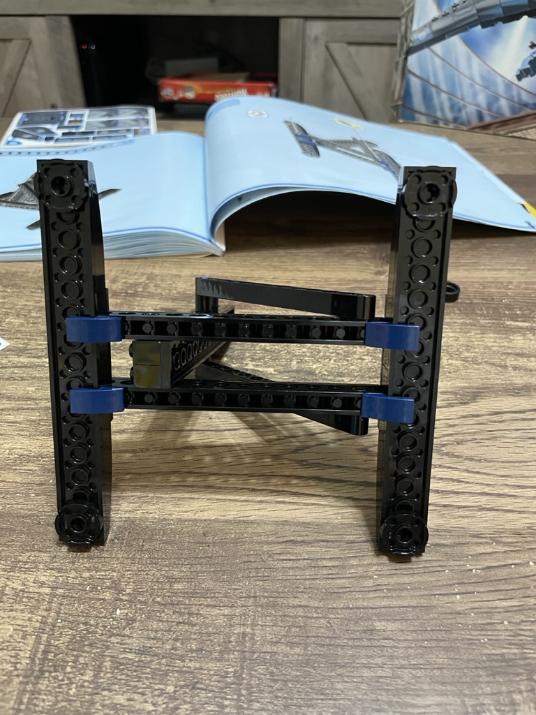 The stand needs some technic elements to bind the verticle stand to the base for stability – achieved by clipping in two pins. Underneath, theres a round 2×2 plate at each corner and 1×2 dark blue slopes at the feet junctions.